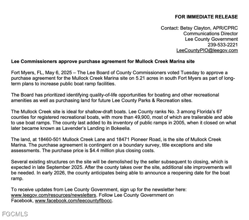 Brand new 1.25 acre prime residential lot at Creekside Estates where you can THINK BIG and build what you want! No HOA. No deed restrictions. No city taxes. Excellent location on Park Road just south of The Harborage next door to Lee County’s newest boat ramp facility at Mullock Creek Marina! The county’s $4.4M acquisition and multi-million dollar WORLD CLASS improvements will enable quick gulf access from YOUR TRAILERED BOAT STORED AT YOUR PROPERTY IN YOUR INCREDIBLE TOY STORAGE BUILDING. Design the home of your dreams on an actual ESTATE SIZED LOT instead of those tiny cookie-cutter 60’x120’ postage stamp gated-community sites. Be your own contractor or hire a general contractor of your choice constrained only by Lee County building codes. This is the perfect place to erect a large storage building or workshop with overhead doors to protect your RV, motorhome, camper, bay boat, pontoon boat, airboat, buggy, tractor, car collection, golf cart, motorcycle, and more. How about an actual yard where children and grandchildren can run and play or build a treehouse! Maybe you just want to own a piece of land where you can have some fun close to home. Not zoned for farm animals, but there is an adjacent horse boarding facility. CREEKSIDE ESTATES is one of the last opportunities to own BRAND NEW large estate-size acreage parcels in beautiful Southwest Florida. Look closely at this location on a map to get excited about proximity to boating, fishing, water sports, Southwest Florida International Airport, Page Field, FGCU, FSW State College, Gulf Coast Town Center, Coconut Point, and everything along US-41 from Fort Myers to Naples. Creekside Estates 1.25 acre properties are hands-down the most exciting land opportunities in SW Florida, period, but there are only 14 and then they are gone. Look through these photos! Watch the video! Get to 5755 Park Road quickly to plant your stake in some good Southern soil. Call now for more information.