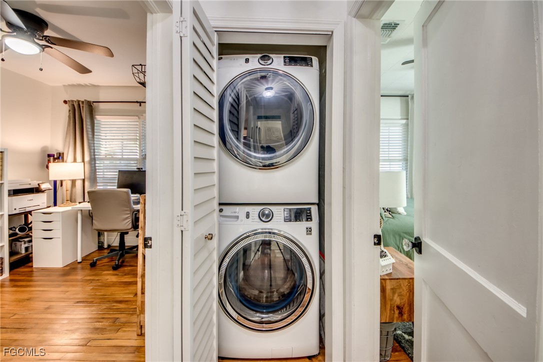 The home features numerous upgrades, including an updated kitchen with large farm style sink, stainless steel appliances, wood flooring throughout, three bedrooms, a fireplace, and a convenient stackable washer and dryer. A full-length rear porch with picture-window screening creates an inviting space to enjoy Florida’s indoor-outdoor lifestyle year-round.