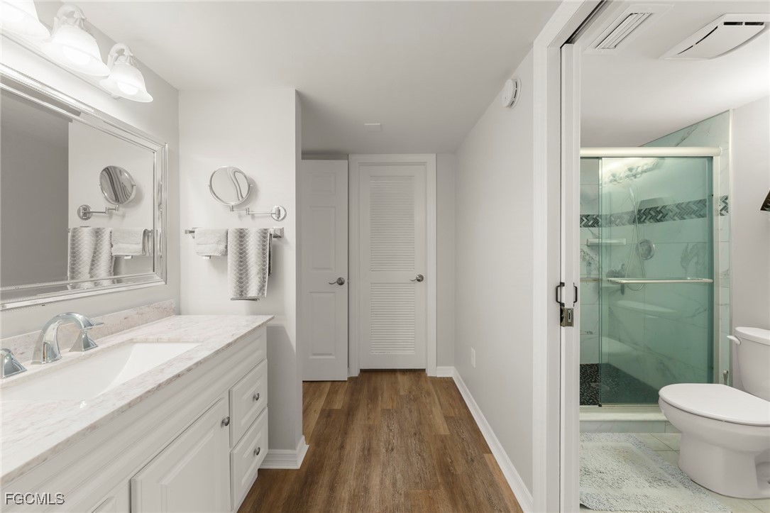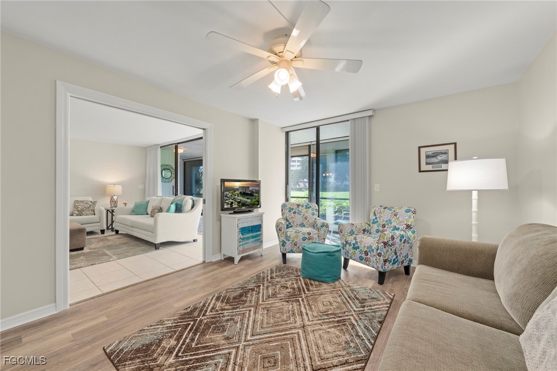 FIRST FLOOR, RENOVATED CONDO!! Located in the desirable Landings community of Fort Myers, this beautifully renovated and thoughtfully reconfigured condo offers a refined coastal lifestyle with modern comforts. The redesigned kitchen has been opened to enhance flow and functionality, featuring quartz countertops, custom wood cabinetry, stainless steel appliances, a double-wide sink, updated lighting, and durable vinyl flooring. The timeless coastal interior design carries throughout the home, creating a light, inviting atmosphere. Both bathrooms have been updated with quartz counters and contemporary lighting, while the primary bath showcases a stunning floor-to-ceiling tiled shower with glass enclosure. The floor plan includes two bedrooms, two baths, and a versatile den ideal for a home office or additional guest space. The lanai offers exceptional flexibility, with the option to be enclosed under air or opened with sliders for a classic screened-in experience, making it perfect for year-round enjoyment of the Florida lifestyle. Trawler Village is known for its welcoming neighborhood feel and convenient access to community amenities, while The Landings offers an exceptional resort-style lifestyle. Residents enjoy bundled golf with an 18-hole executive course, tennis and pickleball courts, a full-service marina with direct Gulf access, waterfront dining, walking and biking paths, and an active social calendar. Whether boating, golfing, or simply enjoying the natural beauty of this gated riverfront community, this is Florida living at its finest.