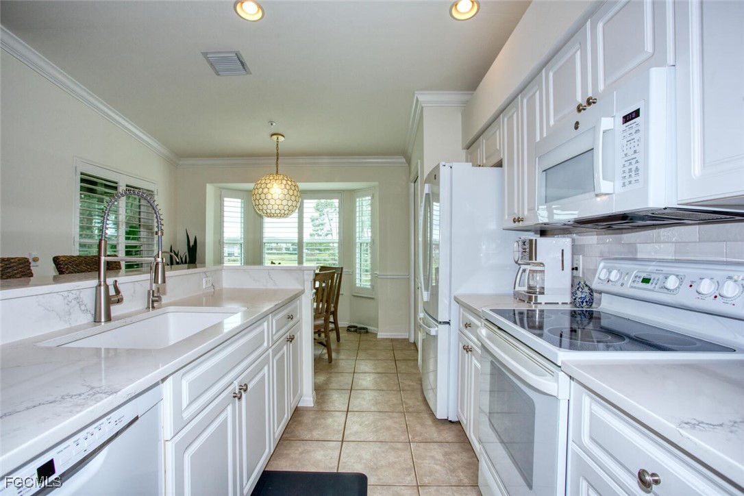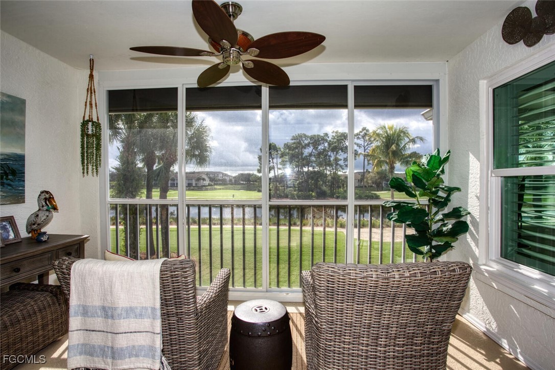 Turnkey, Top-Floor Veranda with Signature Golf & Water Views. This stunning top-floor Veranda is truly move-in ready, offering a decorator’s flair and a fully turnkey opportunity—everything stays. Start your Florida lifestyle immediately with no renovations needed. Overlooking the Royal Course’s Signature Island Hole, this home features sweeping views of water, golf, and abundant wildlife. Thoughtfully designed with a soft, neutral palette and beautiful bird-themed artwork, the space brings the outdoors in while appealing to a wide range of buyers. The popular Dogwood floor plan offers two bedrooms, two full baths, and a den, along with two lanais—front and back—to enjoy Florida’s beautiful weather. Hurricane impact windows and sliders installed on golf course side as well as a shutter. A one-car garage with custom flooring, cabinets and shelving. Attic storage completes the package. Heritage Palms is a lively, resort-style community featuring two golf courses, tennis and pickleball courts, pools, spas, and three dining venues—all delivering exceptional value and affordable fun in a prime Fort Myers location.