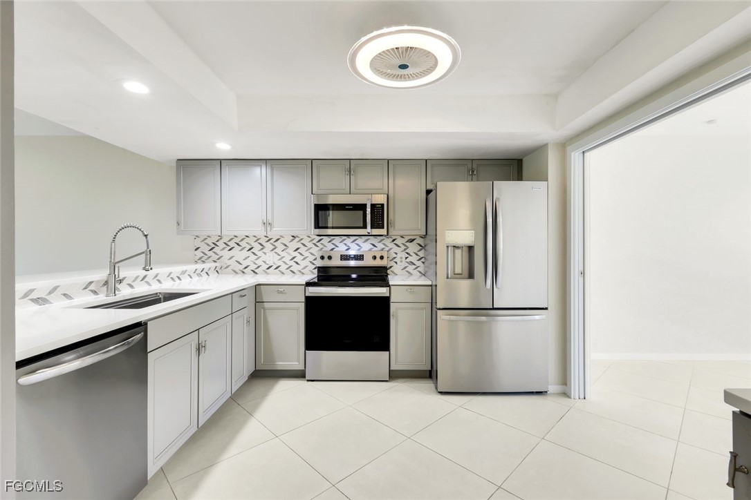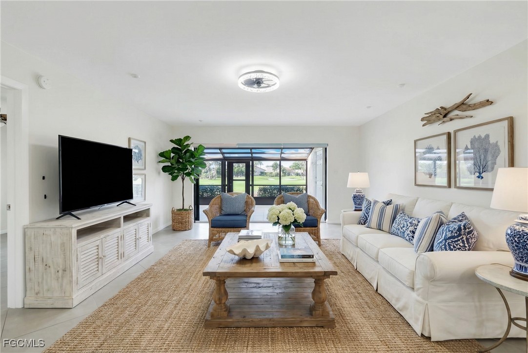 European Design, Sleek 24" Porcelain Floor Tile Throughout the 3 Bedroom, 2 Bath, Huge Sunroom Lanai (450 sq ft.) with Stone Tile, Lexan Panel and Super Screen with Exit Door the 360 Degree Golf Course View (Bear ) Along with Lake View. Quartz Counter Tops, Unique Coffee Station, Range, Large Refrigerator, Beautiful White Wood Cabinetry with Multiple Pull Out Shelves in Pantry. Third Bedroom near Kitchen, Could Be Used as an Office, offers a Large Closet. Primary Bedroom has Hurricane Sliders to the Lanai, Separate Dual Sink Area, with Vessel Style Tropical Sinks, Extra Storage, All Cabinetry in the Home is Real Wood, Soft Close. Walls are painted a Soft White, Great For Artwork. Solid Carport Just Outside the Unit, Easy Access Entry. The Forest Country Club is Optional, Currently there are Membership Incentives for NEW Residents. Some amenities Listed Require Memberships- Children's Park, Dogs are Welcome in Dove's Nest- no weight restriction (with approval)- Leasing is permitted. Hotwire/Fusion Internet Included in Fees, Also Master Fee, water, sewer, garbage, pest, lawn, all Included in Quarterly Fee. Some amenities Listed Require Membership in the Country Club. Great Investment! RSW Airport 15 Min, Sanibel 20 Min, FMB 25 Min, Restaurants, Schools and Shopping Nearby. Bike to Lakes Park for Market Day, or Nearby Coffee Shop/Bakery. NOT an over 55 Community, Over 8 Miles of Sidewalks, Over 25 Lakes with Fish! Gated, 2 Manned Entry Gates. Come Live & Play In The Forest!