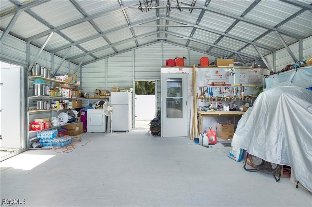 One of the standout features of this property is the impressive 624 sq ft standalone steel garage built on a concrete slab, measuring approximately 36x36x12. Constructed with 14-gauge steel beams and 28-gauge steel siding, the structure is rated to withstand winds up to 165 mph. This garage is perfect for storing RVs, boats, trailers, recreational vehicles, tools, or for use as a workshop or hobby space.