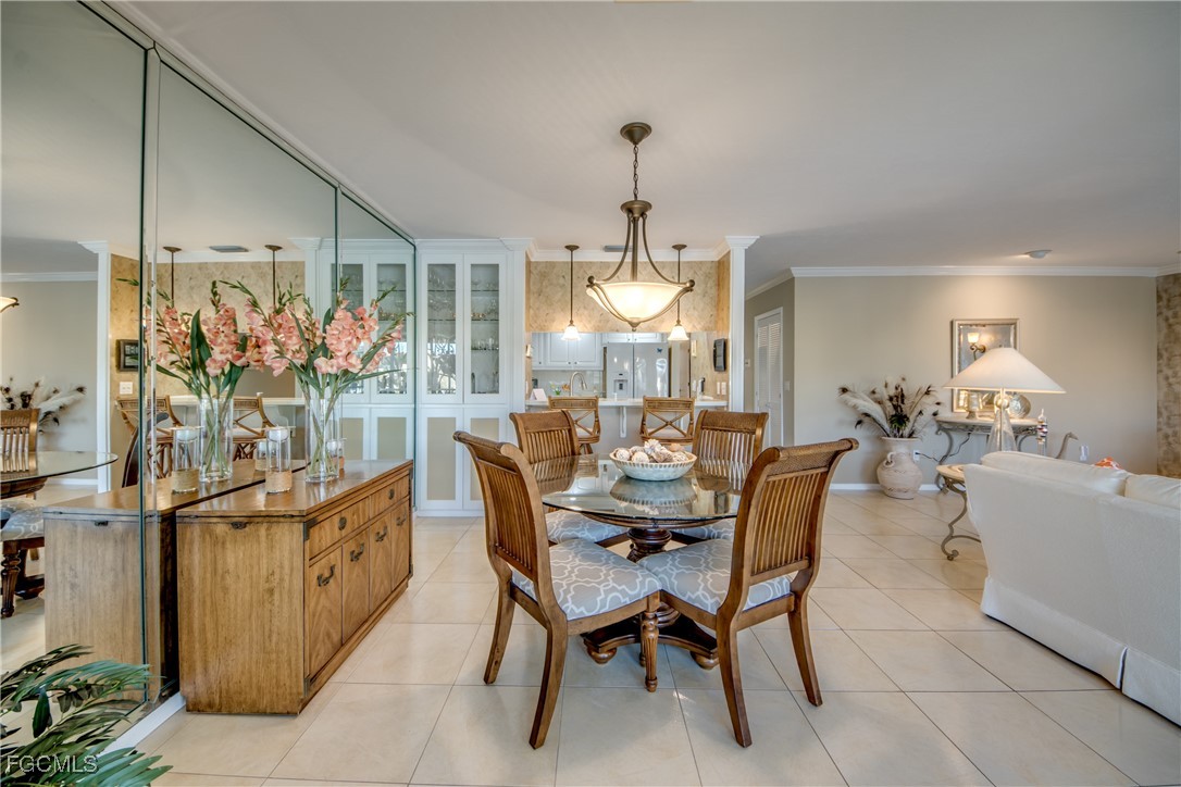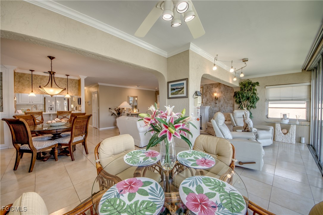 The spacious primary suite serves as a relaxing retreat with a generous walk-in closet and an updated en-suite bath with a glass shower enclosure. The bright white kitchen is clean and functional, featuring Corian countertops, newer appliances, a pantry with shelving, tray ceiling accents, and pendant lighting—perfectly positioned to stay connected to the living and dining areas. A built-in bar area off the dining space is ideal for sunset cocktails after a day on the water, while dimmer lighting throughout allows you to create the perfect ambiance.