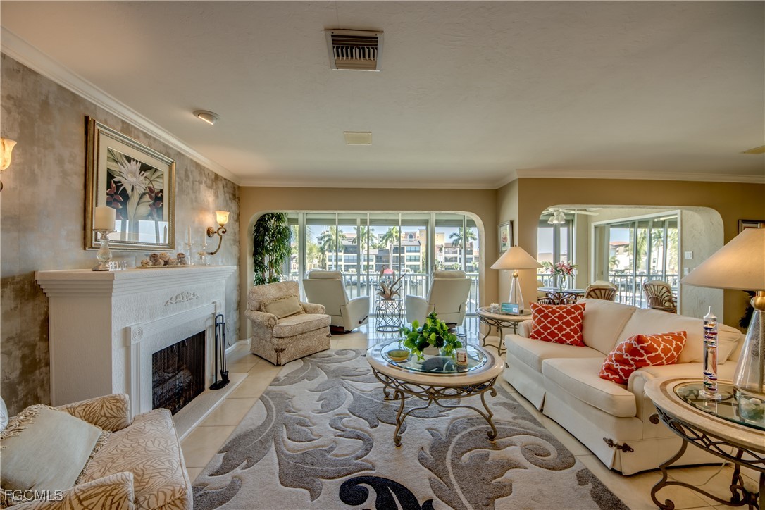 Inside, the open-concept living, dining, and kitchen areas are designed to capture the stunning canal views, creating an inviting space for everyday living and entertaining. Offered fully furnished, the condo features two fireplaces, tile flooring throughout the main living areas, and carpeted bedrooms for comfort.