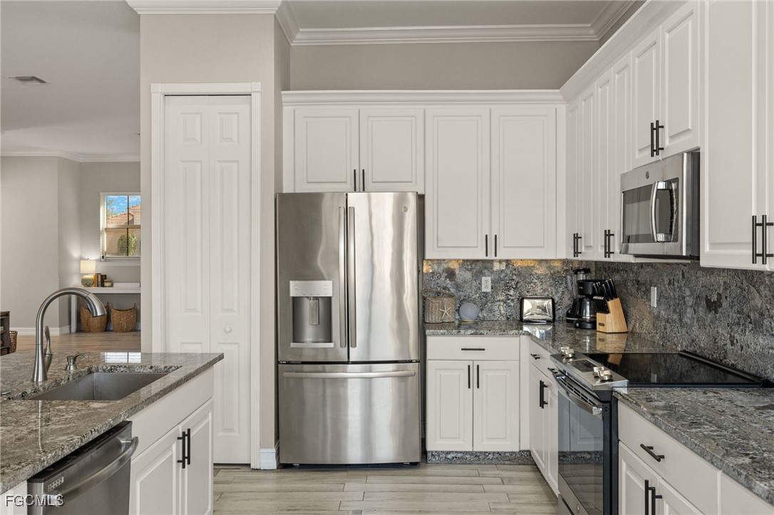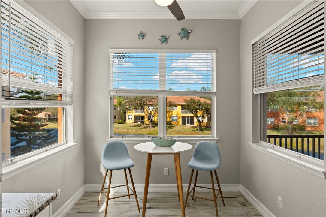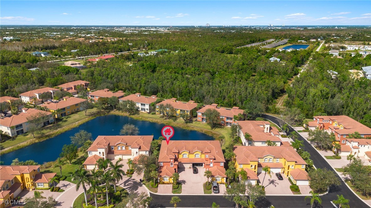 This light and bright second-floor carriage home is ready for you to start enjoying the Florida lifestyle. Inside, you’ll find an open living space with plank tile flooring, high ceilings, and crown molding that give the home an airy, welcoming feel. The kitchen features white raised-panel cabinetry, granite countertops and backsplash, and stainless steel appliances, including a sleek low-profile range. A cozy breakfast nook, surrounded by windows on three sides, is the perfect spot to start your day. The spacious primary suite offers sliding doors to the lanai, a private bath with dual sinks, a separate tub and shower, and a generous walk-in closet. Guests will enjoy their own space with a comfortable second bedroom and nearby bath. The third bedroom, with French doors, easily doubles as a home office or den. Step out onto the screened balcony and take in the peaceful lake views. Portofino’s convenient location puts you close to shopping, dining, ballparks, Six Mile Cypress Slough, and miles of biking and jogging trails—yet once you enter this Tuscan-inspired community, you’ll feel a true sense of calm and relaxation. Schedule your showing and come see why this feels like home.