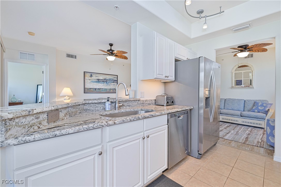Take a look at this 1ST floor 2 bedroom 2 full bath plus den with attached garage and lake view in the gated community of Majestic Palms. The location is only minutes (approximately 4 miles) to Sanibel Island and Fort Myers Beach and close to shopping, restaurants, RSW airport and much more. The community has 2024 roofs and exterior painting. Some interior updates include new countertops, upgraded ceiling and under cabinet lighting, 3 new ceiling fans (5 total) stainless appliances, new microwave. There is also a coffee bar, 3 Tv's, a bunk bed in the den with a full-sized trundle bed, one coach folds out to a full-size bed for extra guest sleeping. There is also a valve under the sink so you can easily wash down the lanai. The attached garage has a loft for additional storage, a grill, card table, beach chairs, and more. Everything you need is included in this turnkey home so just bring yourselves and start enjoying all that sunny Southwest FL has to offer.