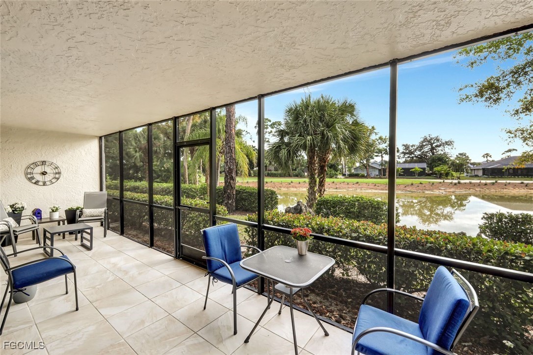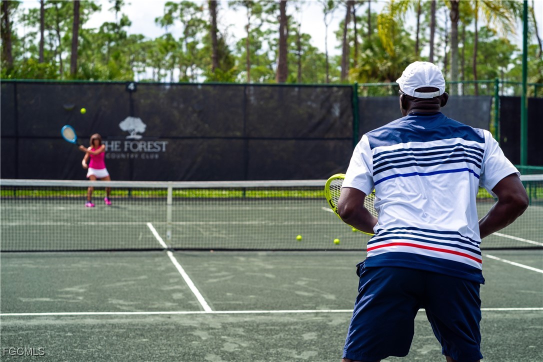 First Floor, CORNER END UNIT- Two Bedroom, PLUS Den, Totally Sold Turnkey (small exclusion list)-Next to Outdoor Grilling and Large Community Pool Nearby. Rear SW Exposure with Lovely Lake and Golf Course View of the New Bear Golf Course #14. Handsomely Furnished and Ready to Live In! Be Sure and Watch the Video! Inside Laundry, Great Den/Office. Tile Flooring in All Main Areas, Carpet in Two Bedroom Suites. Guest Bath Also Joins the Guest Room. Completely Renovated after Hurricane Ian in 2022. One Large Screened Patio and One Side Screened Patio- both with Super Screen. Bring your Binoculars for Bird Watching! Fun to Watch the Golfers Too! Located within the gated Forest Country Club Community, New Resident incentive Discounts, Two Audubon-Certified Championship Golf Courses, Tennis, Pickleball, Bocce, Fun Social Nights! The Community has Two Manned Entry Gates, a pet-friendly environment. a Prime location near coffee shops and restaurants, just 15 minutes to RSW Airport, 20 minutes to Sanibel, and 25 minutes to Fort Myers Beach. Please Note some amenities listed require membership in The Forest Country Club. Join Us! Come Live & Play In The Forest!