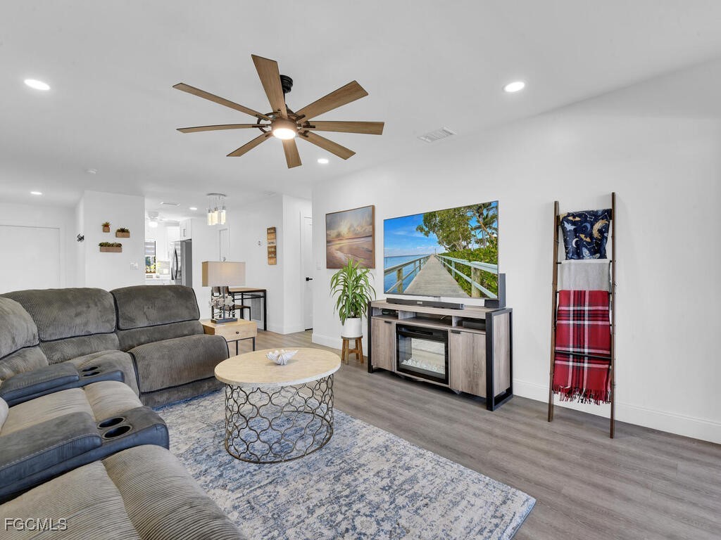 Waterfront condo COMPLETELY RENOVATED down to the studs! This 2nd-floor, 2-bedroom, 2-bath condo is perfect for seasonal or full-time SWFL living, offering a bright modern interior with luxury vinyl flooring in main living areas, premium grade fresh paint, designer light fixtures, in-residence stacked washer/dryer, and a beautifully updated kitchen featuring white shaker cabinets, granite countertops, and new stainless appliances. Both bathrooms are fully renovated with new vanities, tile, and fixtures, while the spacious bedrooms include plush new carpet and a bonus room ideal for a home office or storage. The master suite has a peaceful water view and a walk-in closet w/ custom shelving. You will love relaxing on your private screened lanai overlooking the canal and community pool, with available dock space for easy river/Gulf access by boat. From this rear lanai you can take in some of the most amazing Florida sunsets, watch the fireworks on 4th of July that are released over the river, and enjoy watching the dolphins & manatee play in the canal. Not only is EVERYTHING on the interior brand new but also the A/C compressor & all ductwork, the Roof of building, community Boat dock, and landscaping have been replaced as well. Located in downtown Cape Coral where you will NEVER worry about parking for city events, just steps from restaurants, local shops, and the Farmer’s Market. In minutes on boat or car you can be at Slipaway Food Truck Park & Marina and you are just one street light from the grocery store making it ideal to get to by foot or bike. This MOVE-IN READY waterfront condo delivers true non-maintenance SWFL living at its finest! Community HOA Fee includes Flood Insurance in the dues.