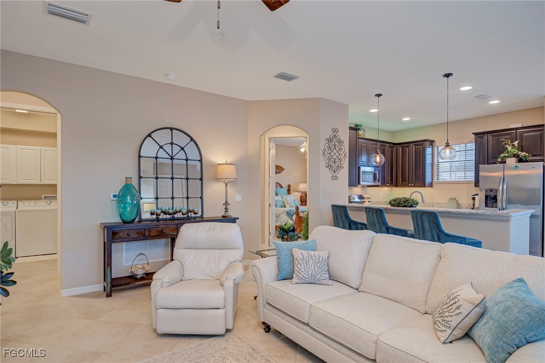 Talk about checking all the boxes! A TURNKEY FURNISHED, WATERFRONT, SAN FERNANDO FLAT (NO STAIRS AT ALL) LOCATED ON A QUAD! This Absolutely adorable home features 2 bedrooms, 2 full bath and tons of upgrades. Most importantly a large screened lanai with water views to enjoy your evening cocktail or morning coffee. Elegant Espresso cabinetry with soft close drawers, Arabesco Granite counter tops, Stainless Steel Appliances, top of the line fixtures. Fantastic LIGHT AND BRIGHT CORNER UNIT, with an open floor plan you'll love. Perfect little getaway! Quad units feature a semi-private pool, grill area in addition to the main amenities. Also, equipped with Hurricane impact glass throughout and fire sprinkler systems, for added peace of mind. PASEO VOTED COMMUNITY OF THE YEAR 9 YEARS IN A ROW!! Come relax by the RESORT STYLE POOL or enjoy a beverage at the TIKI BAR. Watch a game at the PUB or enjoy brunch at the BISTRO. Grab a friend and watch a movie in the cinema or work out in the fully equipped fitness center including a spin/yoga studio. New lighted bike path will connect you to Lee County bike trail system. Enjoy a game of doubles on the 6 har tru TENNIS COURTS or join in the fun at the PICKLE BALL COURTS!! Minutes from the airport and both the Twins and Red Sox Spring Training Stadiums. Nestled in between downtown Fort Myers and the beach. Come enjoy the PASEO LIFESTYLE!