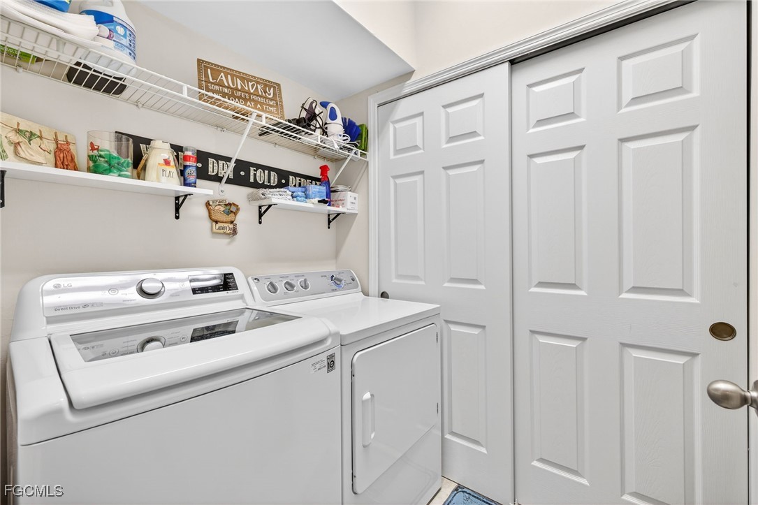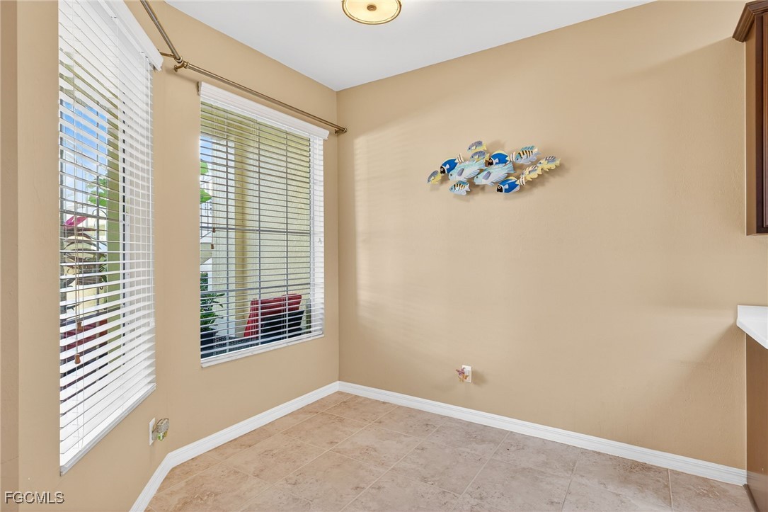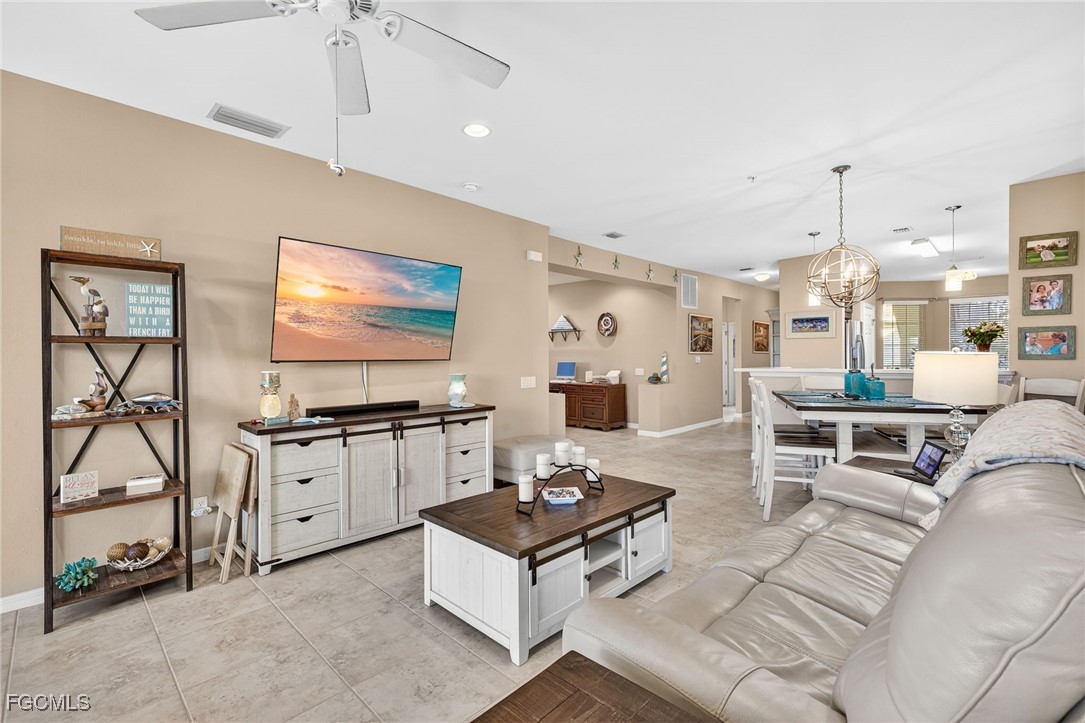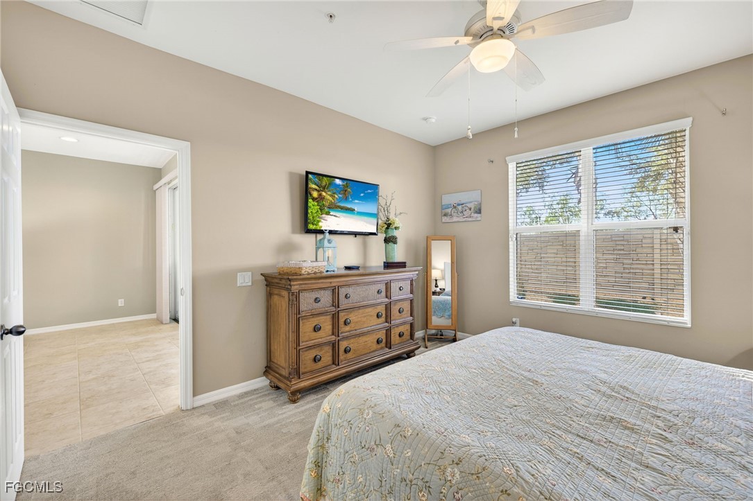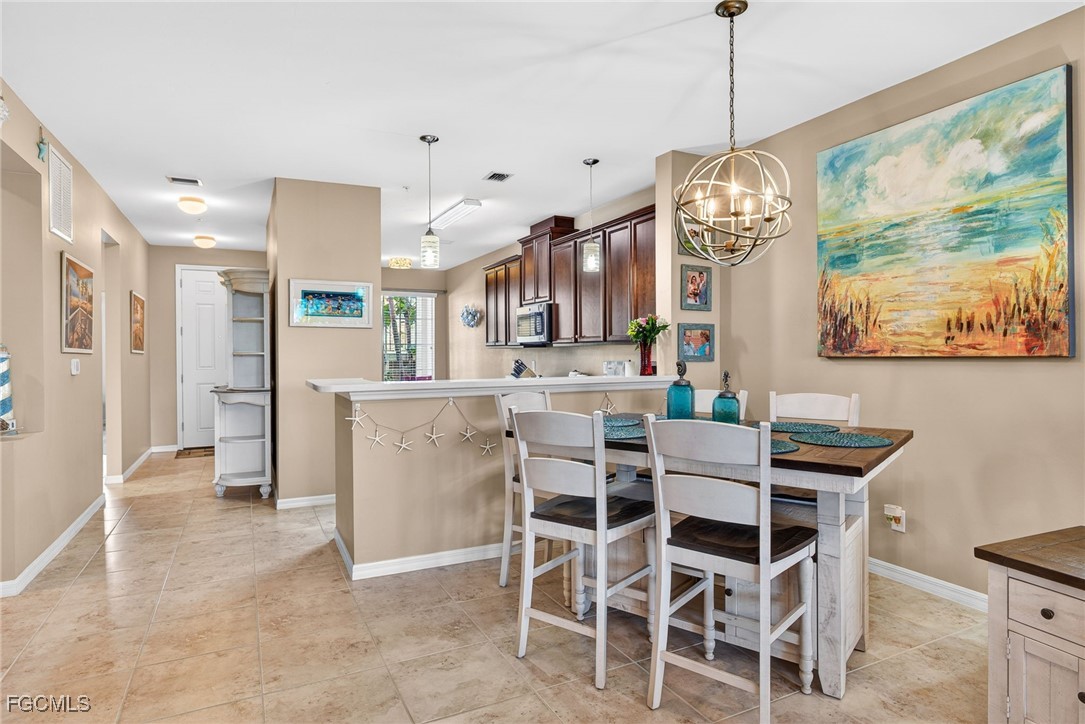 The kitchen is positioned at the front of the condo and features 42” wood cabinetry, stainless steel appliances, ample counter space, and a pantry closet. An additional front sitting area offers a charming spot to relax and enjoy the Florida weather. The kitchen opens seamlessly to the spacious great room, creating an ideal setting for entertaining, with room for an additional dining area.