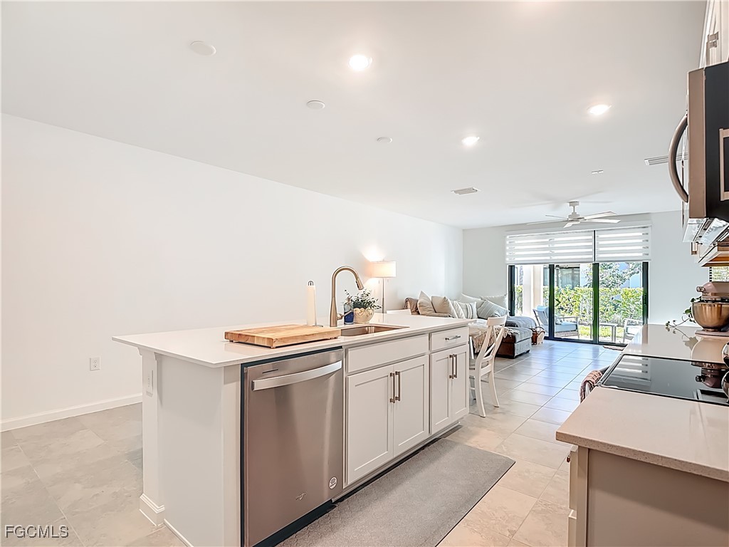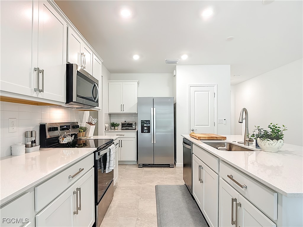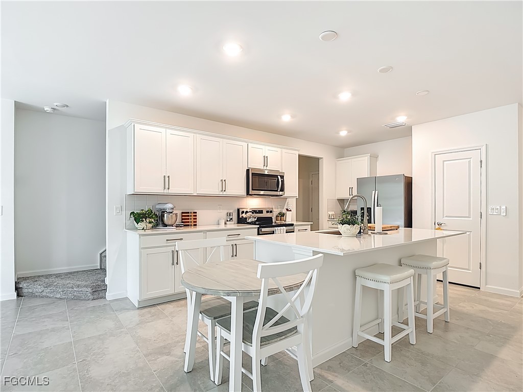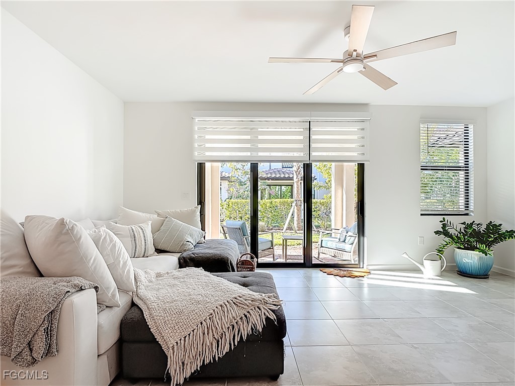 The open-concept kitchen is ideal for both everyday living and entertaining, showcasing stainless steel appliances, quartz countertops and backsplash, modern cabinetry, a large center island overlooking the spacious gathering room. Impact-resistant sliding glass doors lead to a private covered lanai, perfect for relaxing or enjoying morning coffee.