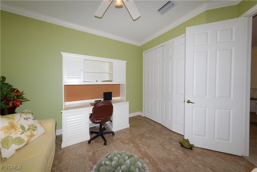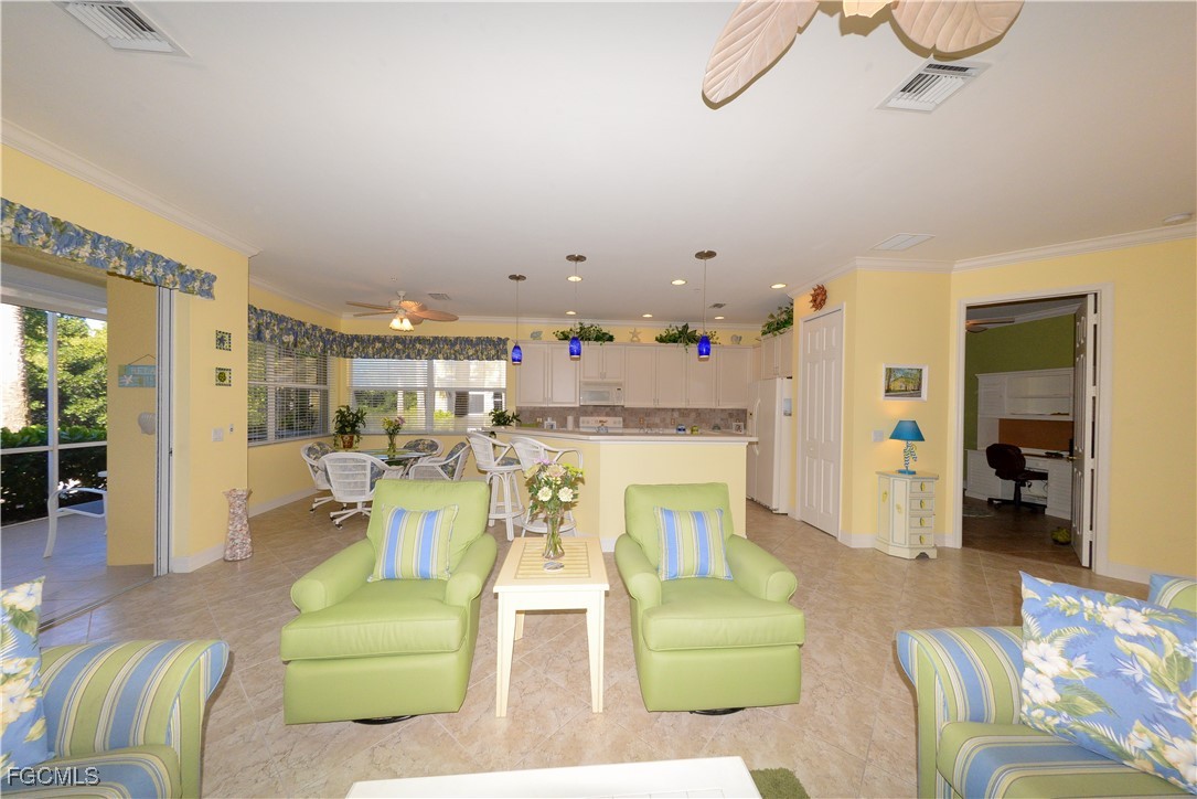 Designed for both comfort and style, the open great-room floor plan showcases 10’ ceilings, 8’ doorways, crown molding, 5” baseboards, and tile flooring throughout, including newer 20” diagonal tile in the main living areas, kitchen, primary suite, and guest bedroom. The home also includes white window blinds, ceiling fans with light kits in every room, and a separate laundry room with cabinetry, sink, washer, and dryer.