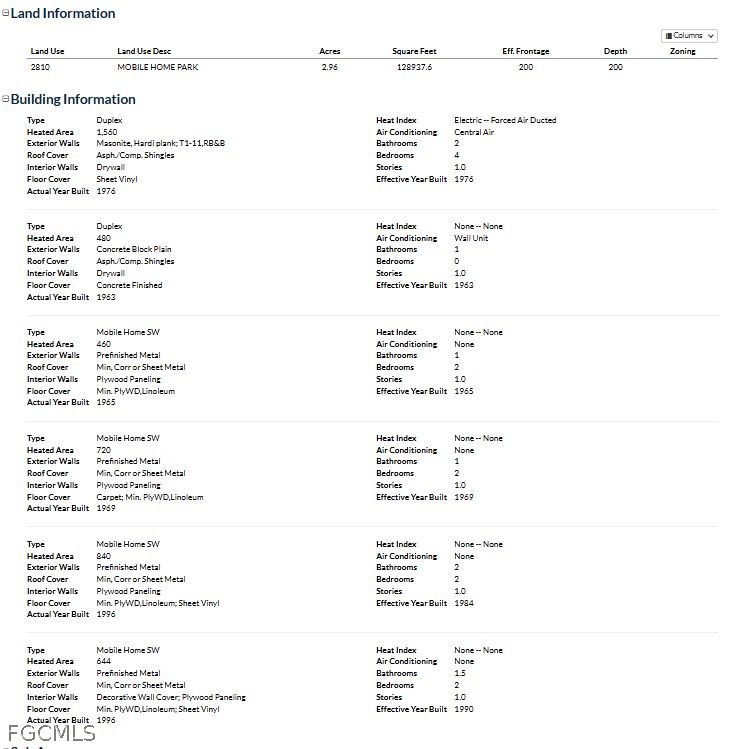 Mobile home rental park with 7 units situated on approximately 2.96 acres along desirable County Road 78! This property is a true diamond in the rough, already zoned for mobile home park use. It includes two houses—one a duplex—both requiring extensive repairs, as well as five older mobile homes ready for renovation or replacement. All units are currently rented on a month-to-month basis (please do not disturb tenants). Opportunities like this are rare, especially in an area surrounded by expanding gated communities and luxury homes.