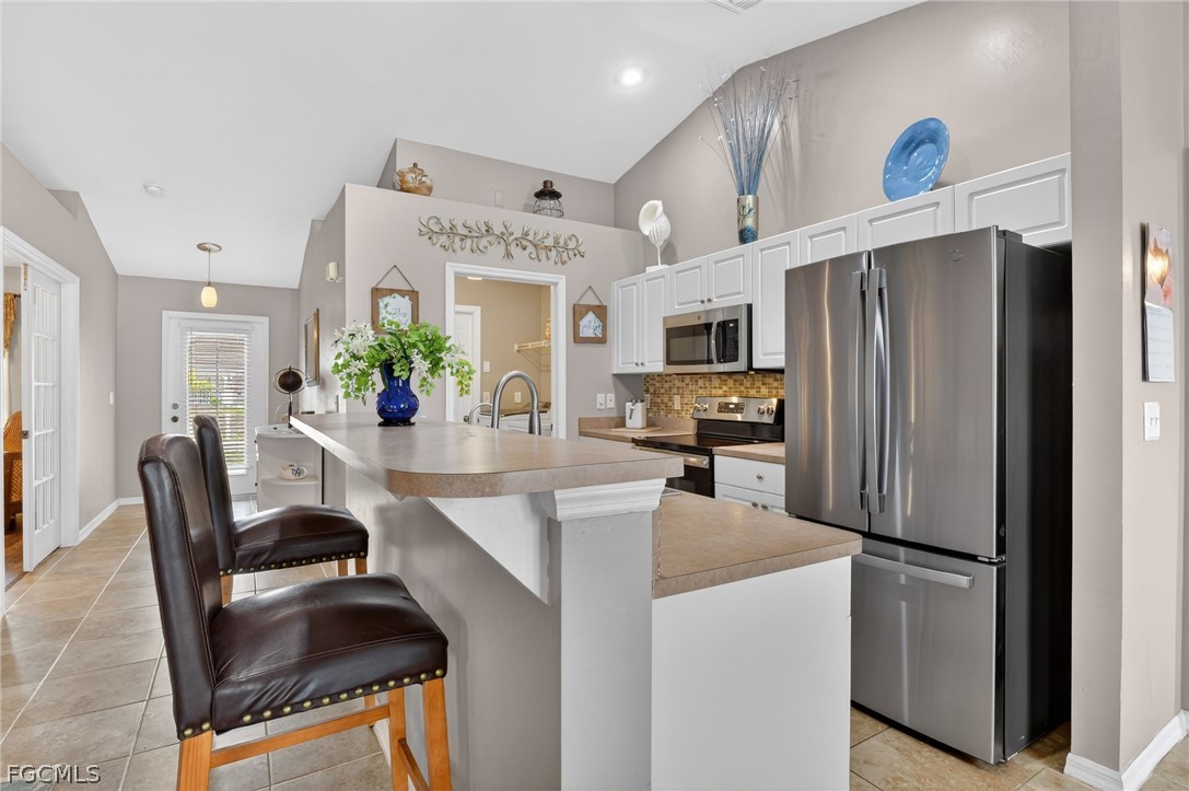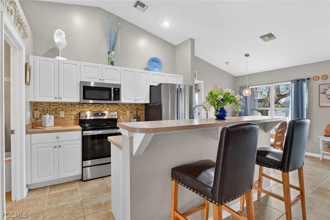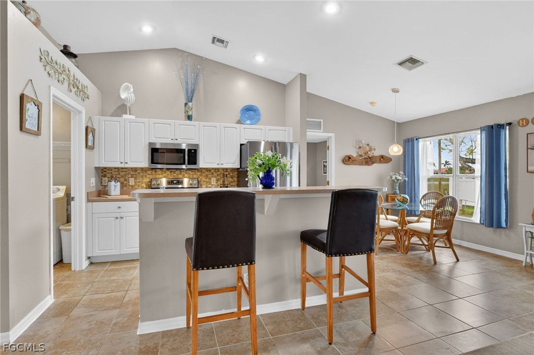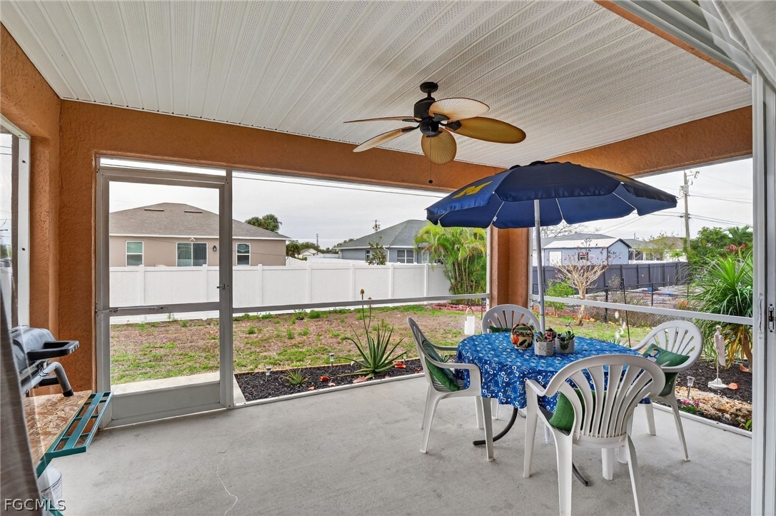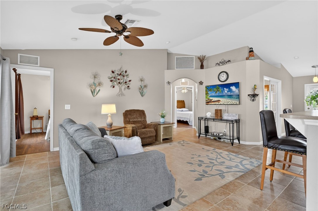 Welcome to this spacious 3 bedroom, 2 bath home with a versatile den in a great Cape Coral location. Thoughtfully designed with an open-concept layout, vaulted ceilings, and split-bedroom floorplan, this home offers both privacy and functionality—perfect for families, guests, or working from home. This property is NOT in a special flood zone, NO HOA and offers plenty of room to add a pool. A dedicated dining area flows seamlessly into the spacious living room, making entertaining effortless. The triple glass door sliders open wide to a lovely covered, screened patio with a tropical ceiling fan. Recent updates include: •New roof (2023) • New A/C (2023) • New water softener (2023) • Well pump (2022) • New durable waterproof wood look flooring (2024) in all bedrooms and the den • New patio screen and ceiling. The kitchen features stainless steel appliances, including a newer refrigerator (2023), dishwasher, microwave, and stove/oven (2021), plus a reverse osmosis system under the sink (2023). Tile flooring runs through the main living areas for easy upkeep. The home has been well maintained with many major updates already completed. Enjoy a spacious backyard with room for a future pool. Prime Cape Coral location near major roads, top shopping, and dining. Minutes from beaches, boat ramps, and outdoor recreation. Convenient to schools, parks, and medical facilities. Live close to everything—restaurants, retail, parks, and waterfront activities—while still enjoying the comfort of a residential neighborhood.