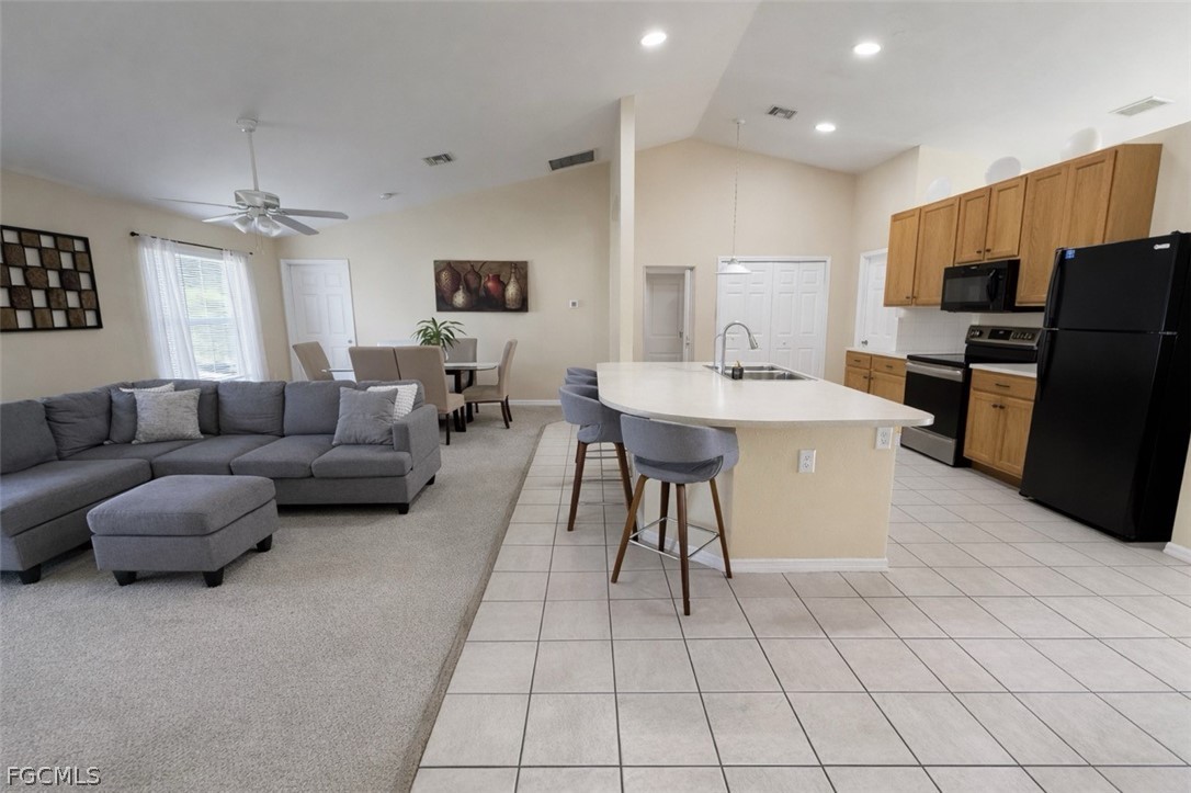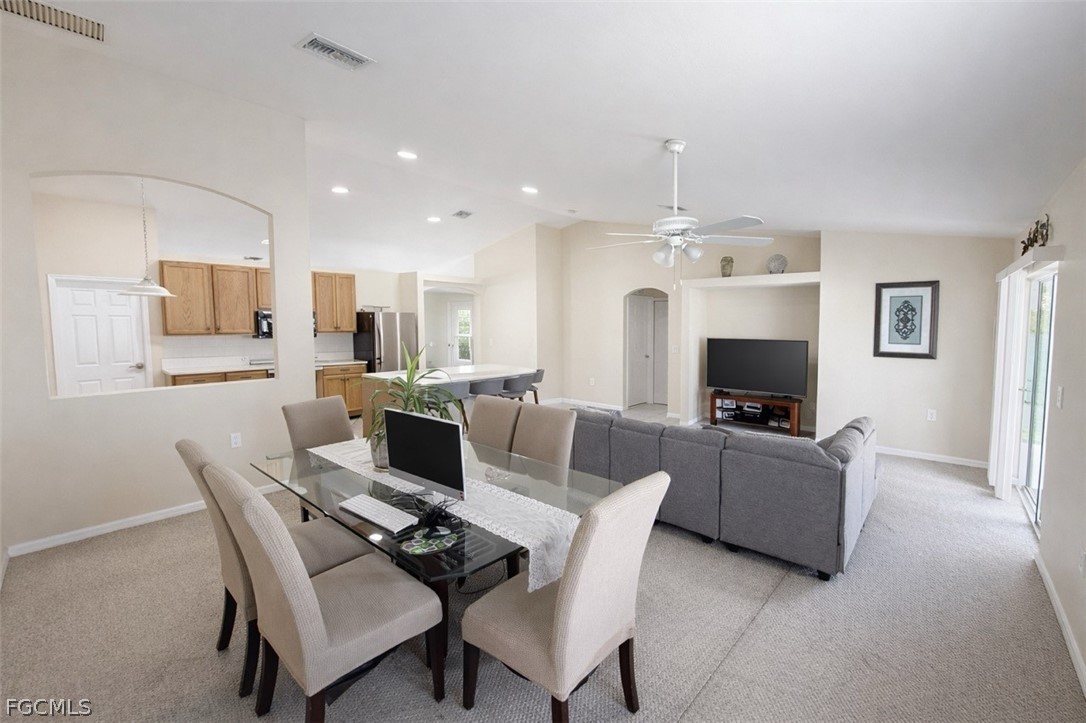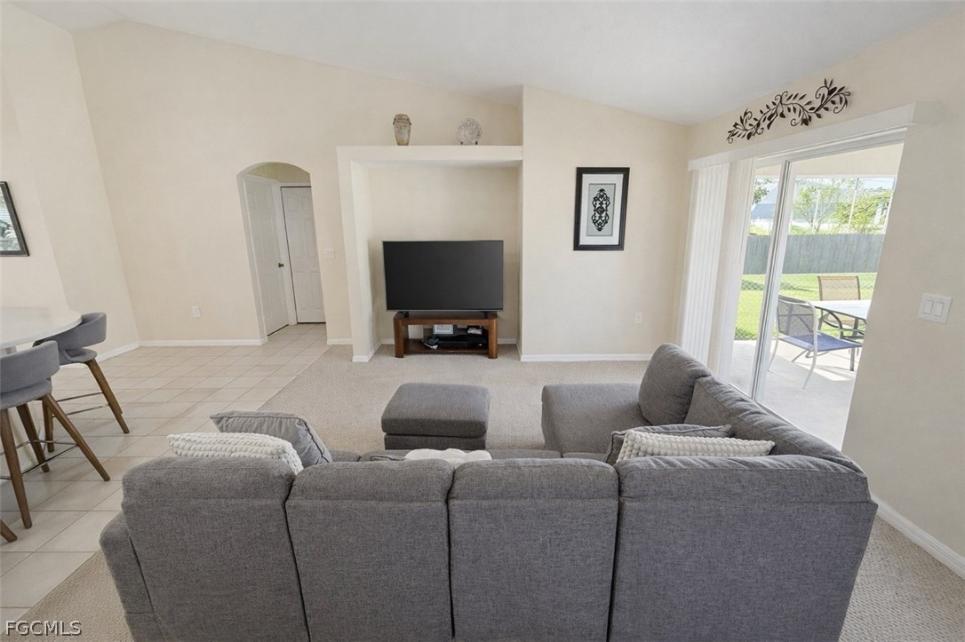 Spacious 3-bedroom, 2-bath home located in NE Cape Coral. This property features an open floor plan with split bedrooms, tile flooring in main areas, and carpet in the bedrooms. The kitchen offers ample cabinet space and a breakfast bar overlooking the living and dining areas. Enjoy the screened-in lanai. Two-car garage and convenient access to shopping, dining, and main roads.