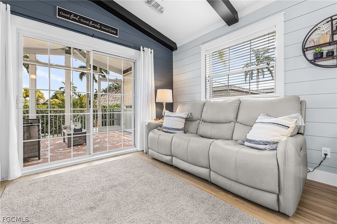 -This home was designed for easy, low-maintenance living; this open-concept home features cathedral ceilings with decorative beams and wide luxury vinyl plank floors along with elegant shiplap wall accents.