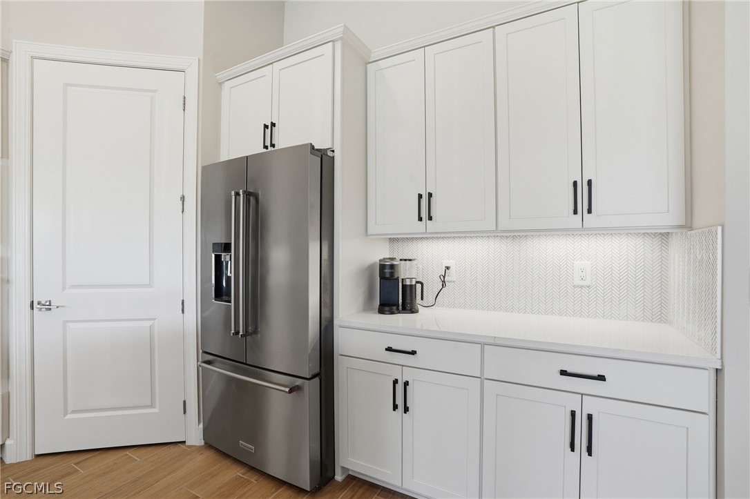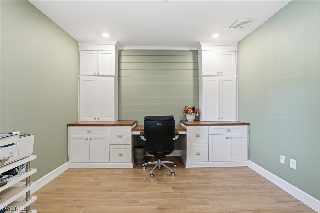 As you enter through the front door, you are greeted by a grand foyer that leads into an interior defined by soaring upgraded high ceilings and elegant wood-look plank tile flooring. This home has been curated with custom craftsmanship that exceeds new construction standards. Toward the front of the home, guests will enjoy a beautiful bedroom with its own private ensuite bathroom, providing a secluded retreat for visitors. Nearby, the dedicated home office features custom built-ins and ample square footage, creating a sophisticated environment.