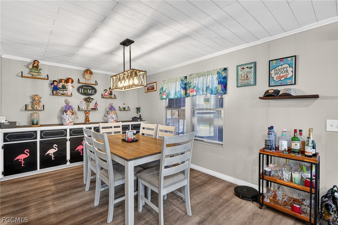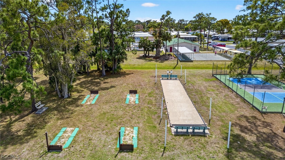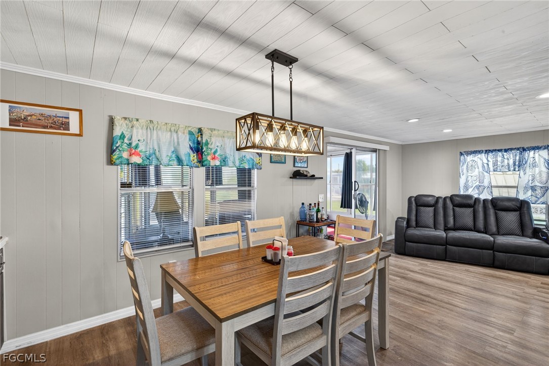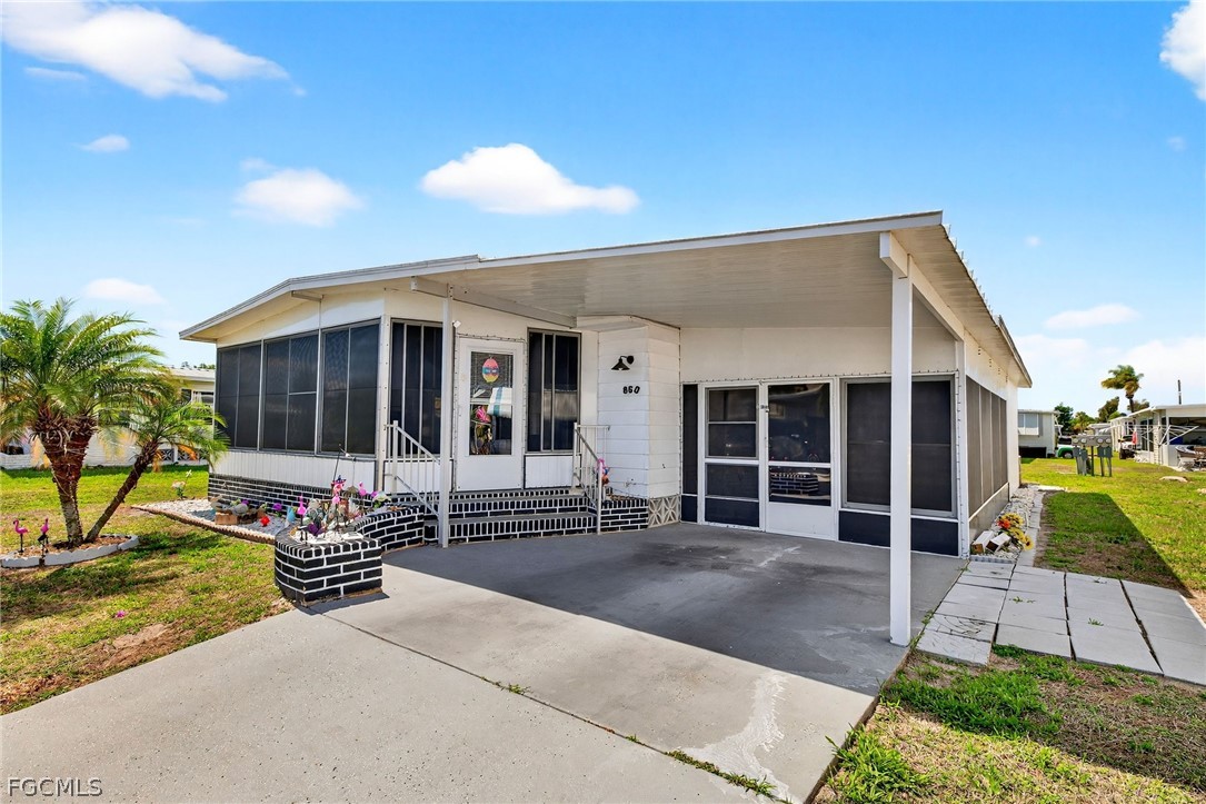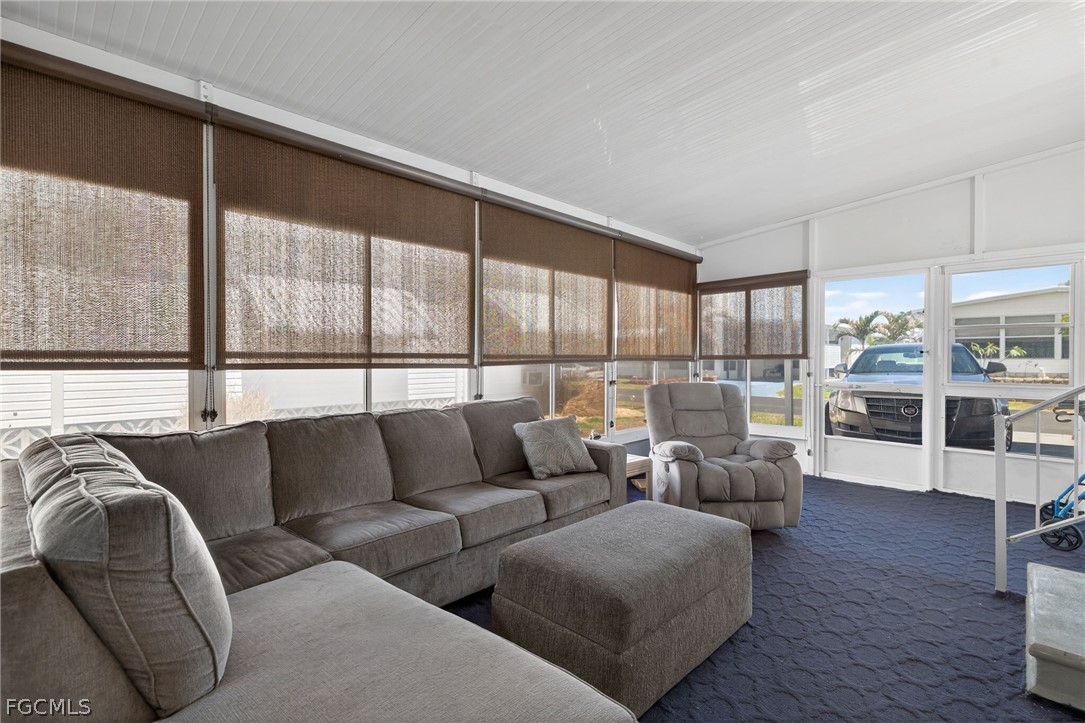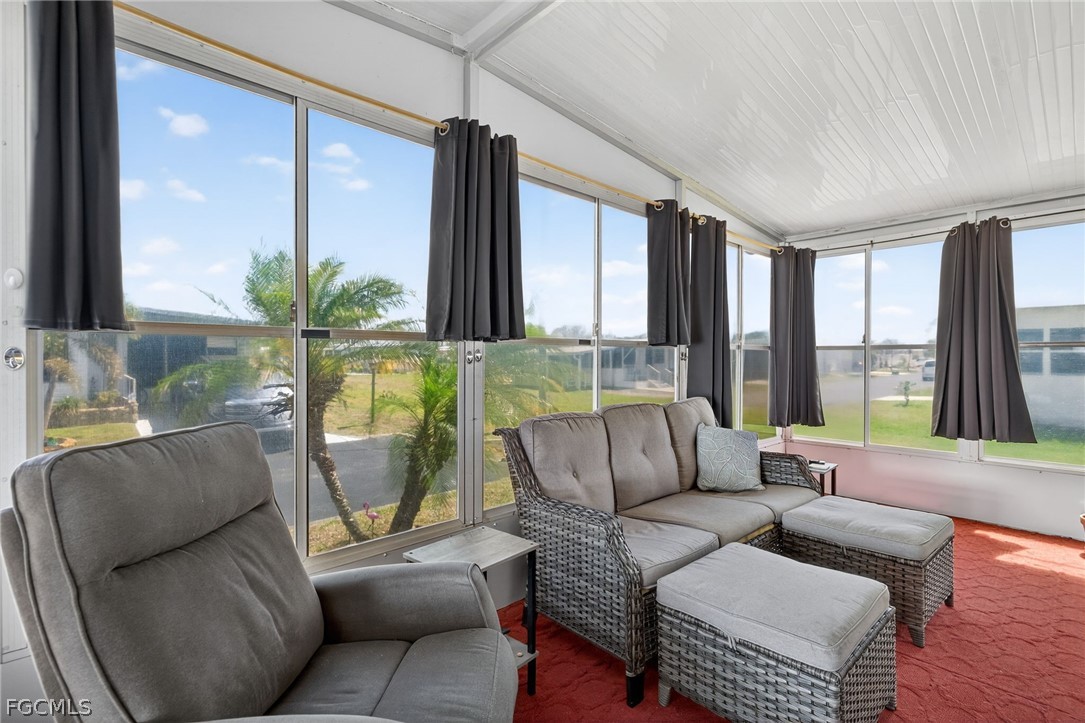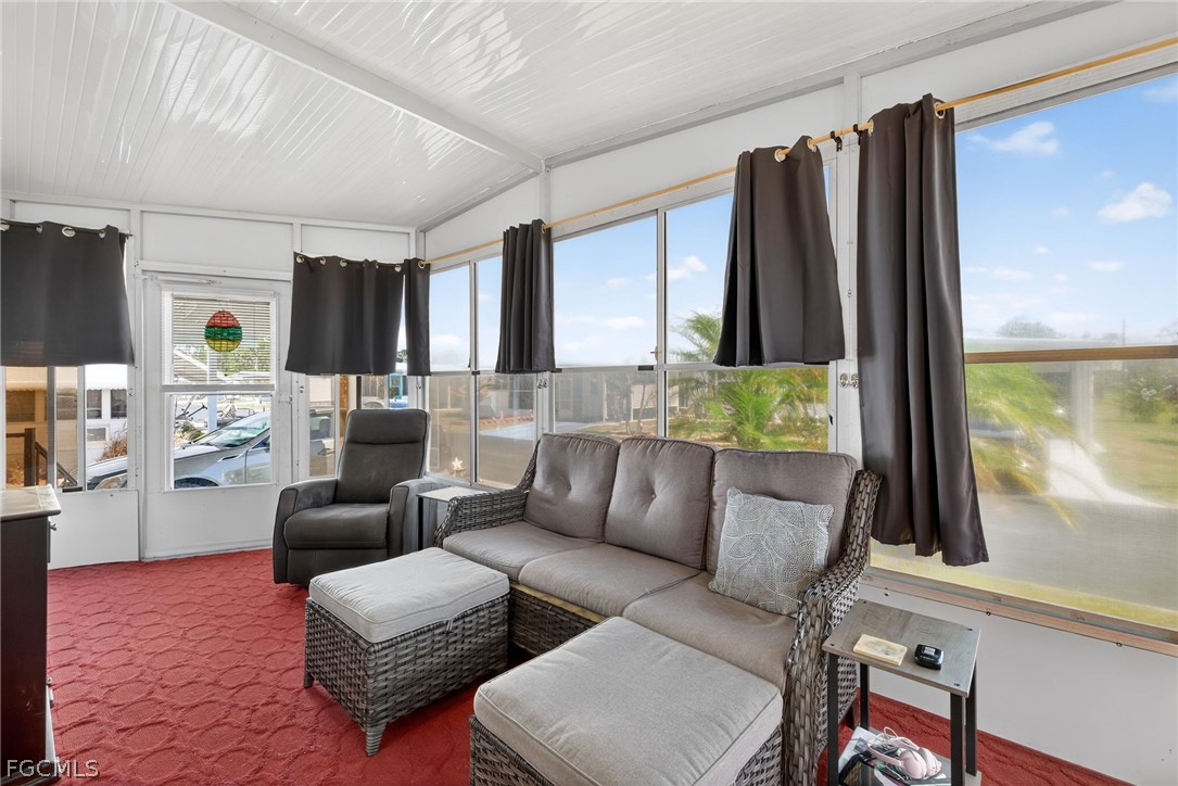 Welcome home to Lazy Days Village! This beautifully appointed home is perfectly situated at the end of a quiet, peaceful street, offering both privacy and charm. Step inside to a spacious, light-filled family room that flows seamlessly into an inviting eat-in dining area and a well-designed kitchen featuring stainless steel appliances, solid surface countertops, a stylish tile backsplash, and a convenient pantry. The generously sized primary suite is a true retreat, complete with a private bath showcasing farmhouse-inspired accents, a walk-in shower, and an oversized closet with abundant space for your wardrobe and accessories. Additional built-in storage, including a chest of drawers and extra closet space, ensures everything has its place. The second bedroom is thoughtfully positioned just across from the updated guest bath, which also features current farmhouse-style finishes. Luxury vinyl plank flooring runs throughout the main living areas and bedrooms, adding both durability and modern appeal. *METAL ROOF 2023 * ROOF OVER ON MAIN ROOF & LANAI 2024* WHOLE HOUSE REPLUMBED 2024* AND VAPOR BARRIER 2025*!! This home truly shines with not one, but two expansive enclosed spaces. The first is a spacious Florida room, accessed through sliding glass doors off the family room—perfect for relaxing or entertaining year-round. The second, located near the ground-level carport entrance and enhanced with custom blinds, offers incredible flexibility as a hobby space, bonus room, or additional entertaining area. Additionally, a large separate undercover laundry room provides even more versatility—perfect for use as a tool shed, hobby room, or extra storage space. Don't forget the amenities...take a stroll through this friendly, vibrant 55+ community and enjoy the heated pool, shuffle board, pickle ball, peaceful park like ponds, and lots of social events!
