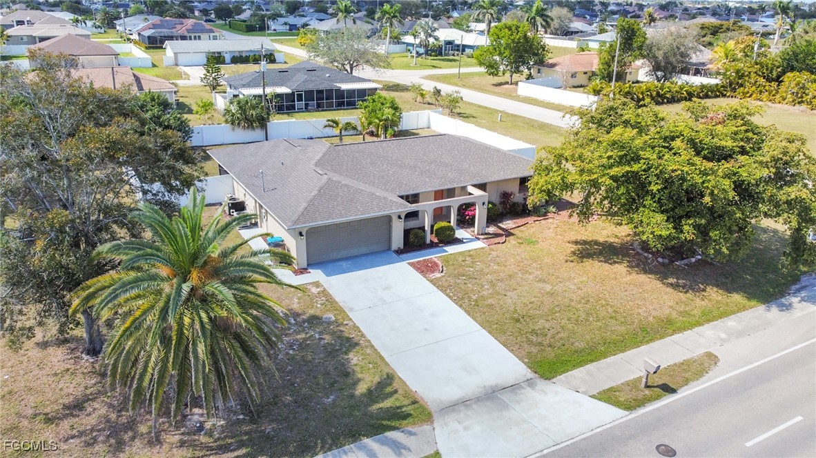 LOCATION! LOCATION! LOCATION! Well-maintained, fully furnished, fenced (outside the flood zone) home with a gorgeous, recently remodeled outdoor pool. This property sits on a 0.38-acre corner lot, making it a Cape Coral gem thanks to its prime location, lot size, and 4 bedrooms. Upon entering, the first thing you'll notice is the abundant natural light pouring into the room, creating a warm and inviting glow. You'll find spacious bedrooms to the right and down the hall. The highlight of the property is the kitchen and dining area! The kitchen wraps around the space and is equipped with stainless steel appliances, ample cabinetry on the floor and walls, as well as a huge island with its own additional storage space. The attached dining area is large enough to accommodate the entire family while on vacation and still have room to spare. 2021 roof, 2015 PVC fence, new 2023 pool heater! Don't miss this opportunity and schedule your visit today!