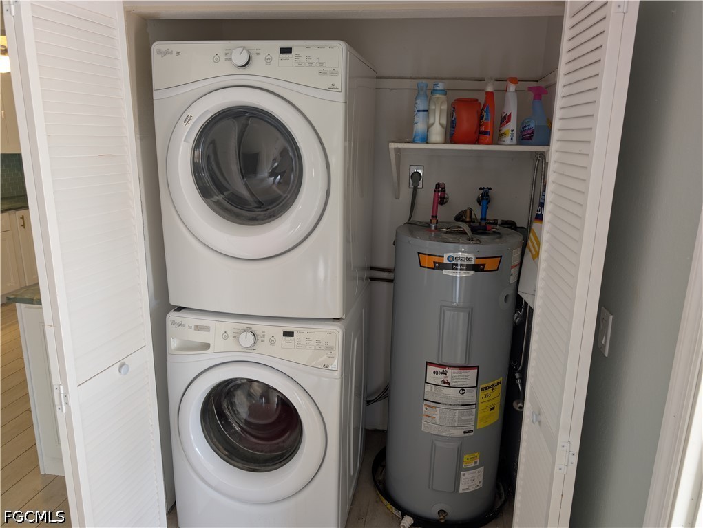 The primary bathroom features an upgraded shower with grab bars for added ease, along with a walk-in soaking tub designed for comfort and relaxation. A stackable washer and dryer maximize closet space, adding to the home’s efficient layout. Additional value comes with a newer hot water tank, offering peace of mind for future ownership.