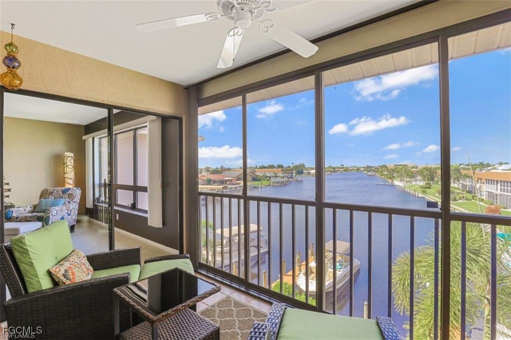 STUNNING PANORAMIC VIEWS from almost every room of this beautiful and desirable corner unit. This condo offers the best views in the complex allowing you to easily see the frequent Dolphin visits and many other marine life, including Manatees. Situated at the end of a huge intersecting 200' wide, deep water Sailboat Access canal; just minutes to the Caloosahatchee River where you can enjoy a day of boating , fishing and dining. Park and keep your boat docked in one of the available slips right in your own backyard. Enjoy a walk to Jaycee Park just two blocks away. This updated unit features 2 bedrooms, 2 baths, screened in lanai, and rare waterfront views from "both" front and rear of unit. Re-piped - ,Hurricane Windows- New Roof plus reserved parking and extra storage.Full Background and HOA Application Required