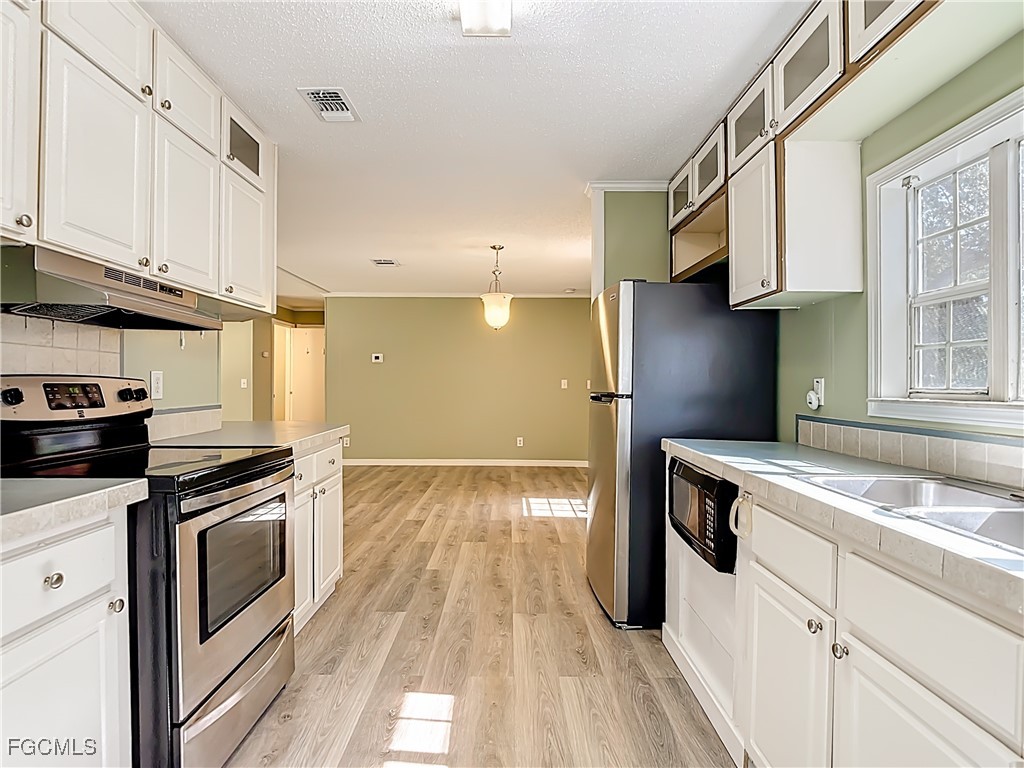 Step inside to a modern interior with brand-new luxury vinyl plank flooring, and fresh contemporary paint throughout. The open, airy, front-facing kitchen brings in natural light and includes stainless steel appliances, a large pantry, custom wood window treatments, and a dine-in layout ideal for everyday living.