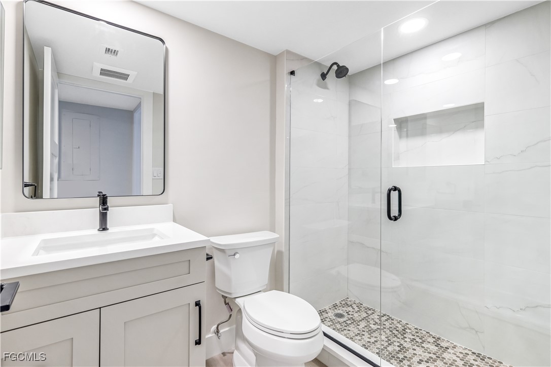 The kitchen features quartz countertops, stainless steel appliances, new custom cabinetry, and efficient LED lighting. Both bathrooms were completely redesigned with contemporary tile selections, quartz vanities, and frameless glass showers. Mechanical systems, electrical components, and interior fixtures were replaced as part of the comprehensive renovation.