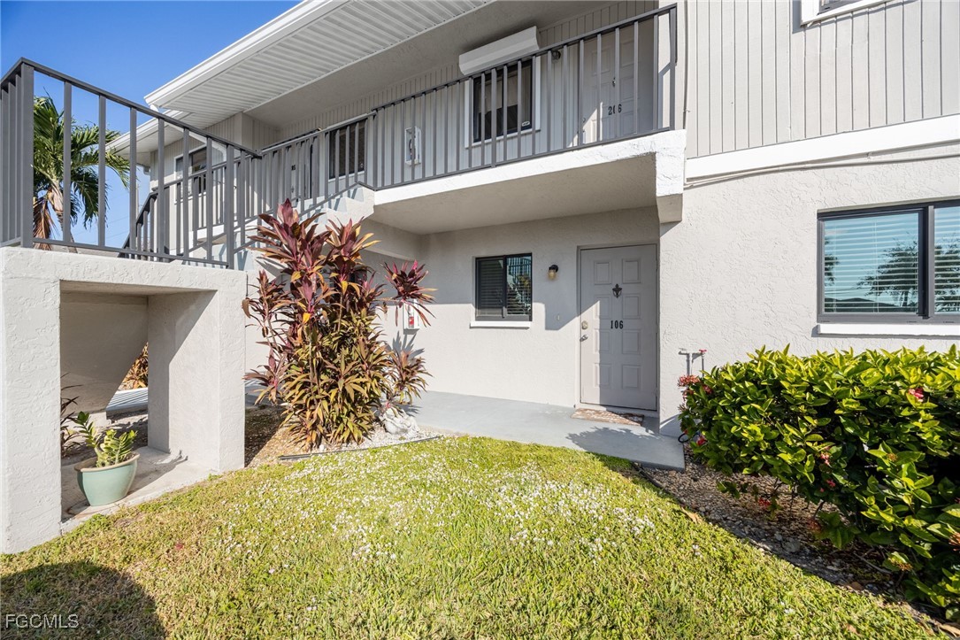 Experience comfortable living in this nicely updated 2 bedroom, 2 bathroom condo in the heart of Cape Coral. Inside, you’ll find a refreshed kitchen with new appliances, stylish tile backsplash, and attractive cabinetry. New laminate flooring, complemented by impact-resistant front windows, new doors, new blinds, and updated bedroom fans. Enjoy a well-maintained community pool and an unbeatable location along Cape Coral Parkway—just minutes from popular dining and the highly anticipated renovation of the Cape Coral Yacht Club. This unit is ready for its new owner! The property legal description is listed as #102 but condo number listed on door is #106.