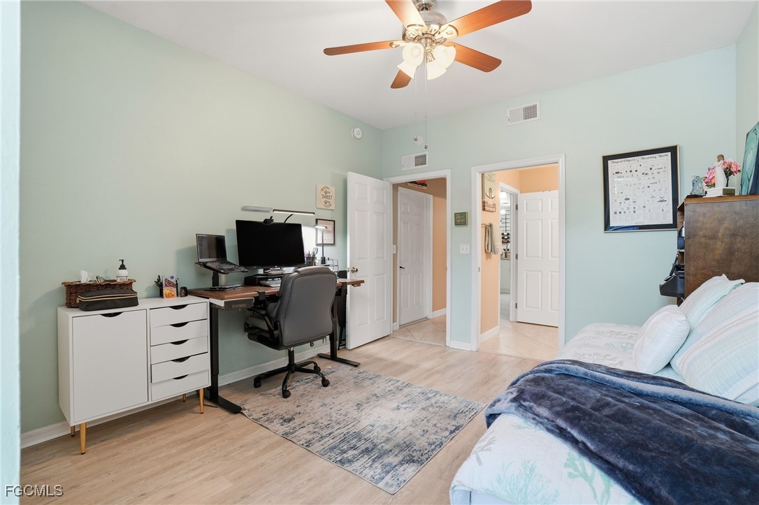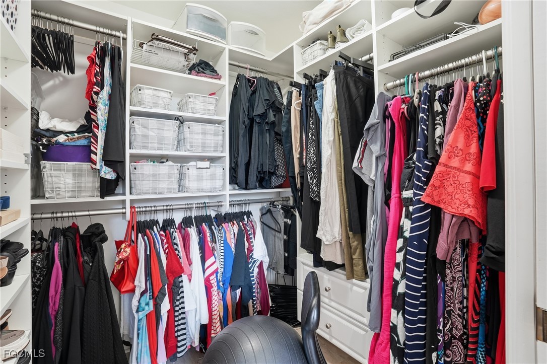 The spacious primary suite offers calm and comfort, complete with a fully customized California Closets walk-in closet. An additional large storage closet—also outfitted with California Closets—keeps everything organized and within reach. Both bedrooms provide ample space and privacy for owners and guests alike.