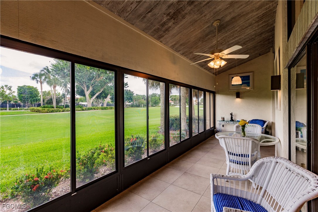 The newly screened lanai has an added enclosure that is engineered to withstand 125 MPH winds. New lighting, a ceiling fan, and a contrast-painted ceiling add style.