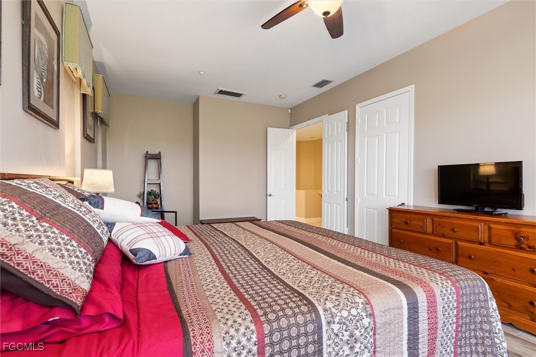 The primary suite offers a massive walk-in closet, private screened lanai, dual-sink granite vanity, garden tub, and separate walk-in shower. Secondary bedrooms also feature walk-in closets, and all bathrooms are finished with wood cabinetry and granite.