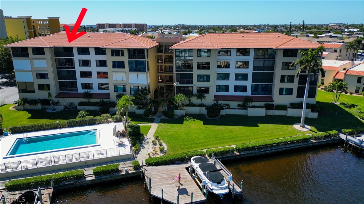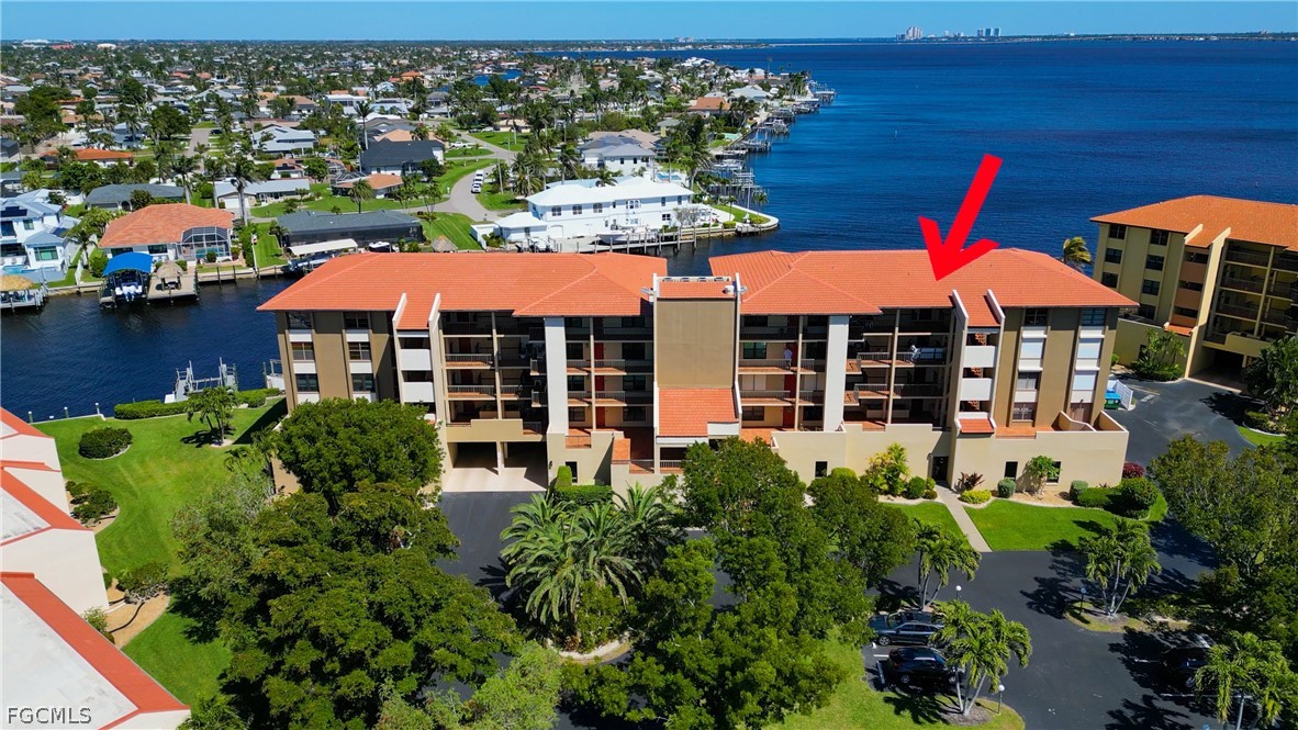 THIS PENTHOUSE VIEW DOESN’T WHISPER… IT’S A SHOW-OFF. Commanding panoramic water views from nearly every angle, this 5TH-FLOOR PENTHOUSE places you in a front-row seat to the ever-changing beauty of the CALOOSAHATCHEE RIVER. With NO NEIGHBORS ABOVE and endless blue horizon stretching before you, this residence feels like your own private retreat in the sky. Nearly 1,300 sq ft of smartly designed living space makes this penthouse live more like a single-family home than a typical condo. The expansive 27’ WIDE GREAT ROOM immediately draws your attention, where large windows frame the river like a living work of art. Sunrises pour into the space, filling your home with natural light and creating a bright, open atmosphere throughout the day. Your 15’ x 7’6” tiled balcony becomes the perfect place to begin the morning with coffee over the water—much like standing on the deck of a luxury cruise ship, only without the crowds. Dolphins and manatees occasionally glide through the water below while kayakers and plenty of boaters drift peacefully along the river. The kitchen offers generous storage, granite countertops, newer appliances and a convenient pass-through to the dining area, making entertaining easy. The spacious great room-style layout creates an open, airy environment that flows effortlessly for both relaxing evenings and gatherings with friends. A split-bedroom floor plan provides privacy for guests. The primary suite serves as a comfortable retreat with balcony access, a large walk-in closet, dual sinks, walk-in shower and private commode. Evenings bring their own magic as summer storms roll across the river and holiday fireworks light up the sky, giving you front-row seats to nature’s most spectacular light show. Two additional front porch sitting areas provide even more space to relax and enjoy the peaceful surroundings. Practicality meets convenience with an in-unit laundry room, extra ground-floor storage unit and a reserved UNDER-BUILDING PARKING SPACE that keeps your vehicle cool and protected from the Florida sun. This intimate 24-UNIT COMMUNITY is tucked away at the end of a quiet cul-de-sac and surrounded by lush, park-like grounds with mature shade trees. Residents enjoy a heated pool and scenic community terrace ideal for sunset gatherings. The association has reserves and NO SPECIAL ASSESSMENTS. Upcoming fully funded improvements include a new elevator and a waterfront walking path. Next door, the BRAND NEW $16+ MILLION JAYCEE PARK opening VERY SOON will create one of Cape Coral’s most beautiful waterfront destinations, featuring a new riverfront walking trail and shaded seating areas overlooking the water. Minutes to beaches, shopping, dining, RSW Airport & more. LOCATION, LOCATION, LOCATION — the first rule of real estate. Opportunities to own a penthouse riverfront residence like this are rare. Secure your front-row seat to the rhythm of the river before someone else does. WAKE UP TO THE WATER. EVERY. SINGLE. DAY!