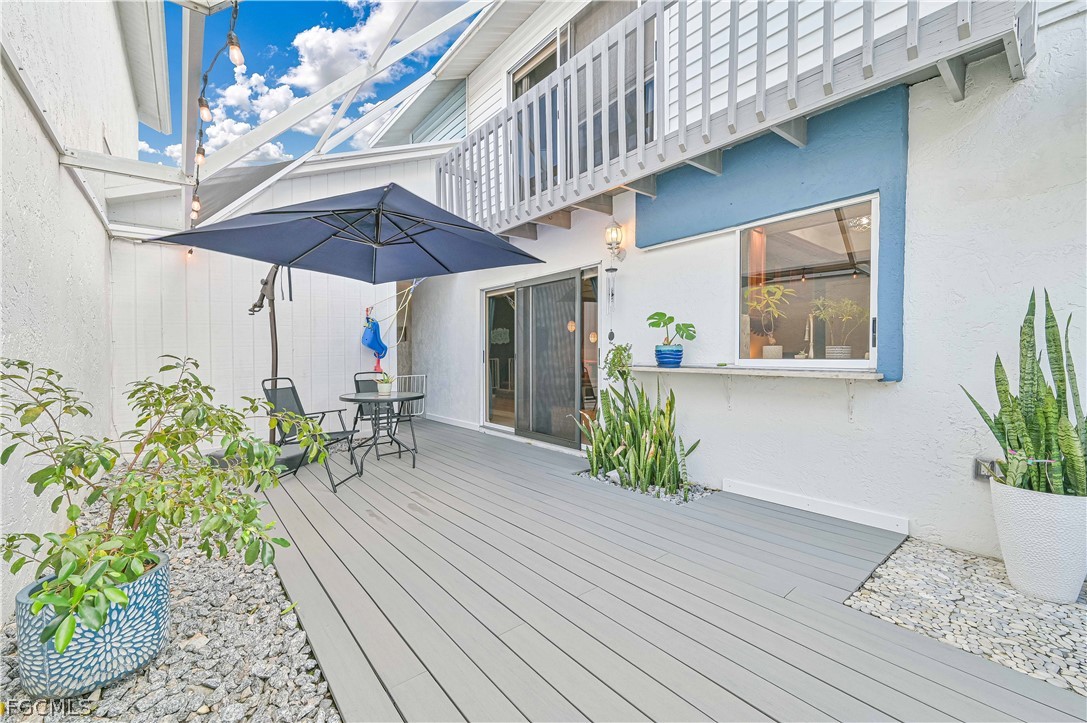 Additional upgrades include a 2021 A/C system, designer flooring on the first level, and new carpet installed in 2025. The roof was replaced in 2023, providing peace of mind for years to come. The front bedroom features hurricane-impact glass, and the patio area was enhanced with Trex decking installed in 2025, creating a perfect outdoor space to relax or entertain.