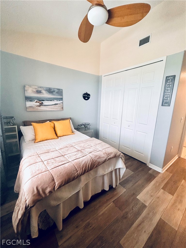 The kitchen includes a cozy breakfast nook, updated appliances, a pantry, and a convenient breakfast bar. The owner’s suite opens onto the screened lanai through sliding glass doors and features his-and-hers walk-in closets.