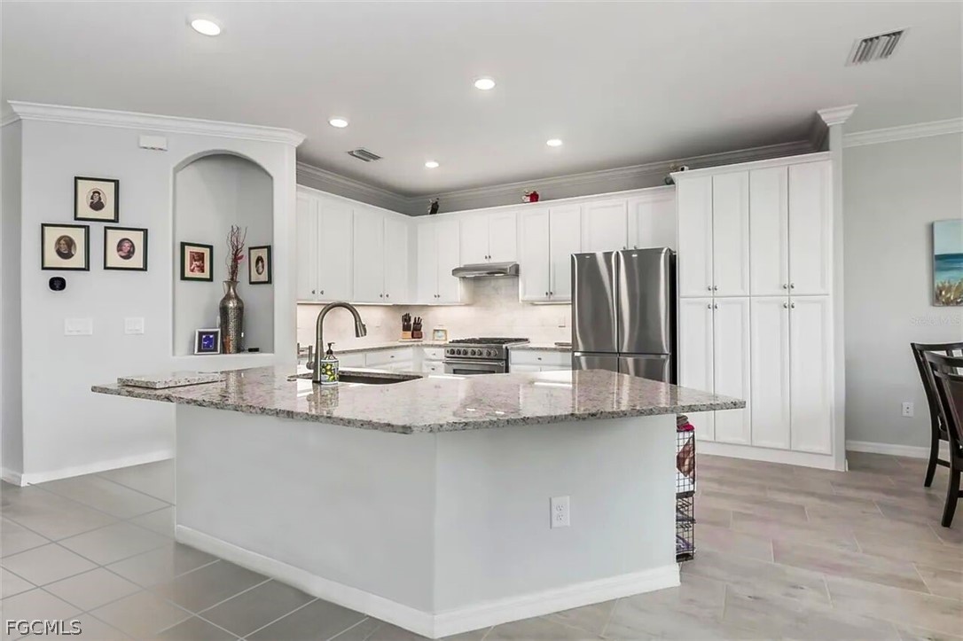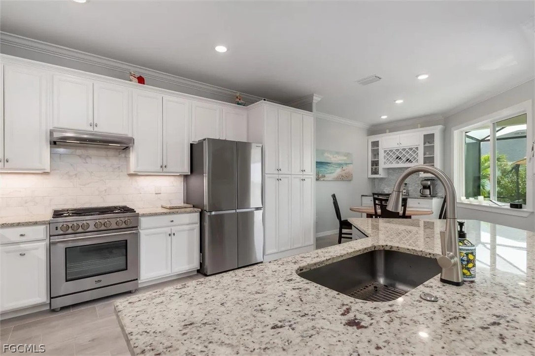 Experience refined Florida living in this exceptional 4-bedroom, 2-bath residence, thoughtfully crafted to blend elegance with everyday functionality. At the heart of the home, a beautifully designed gourmet kitchen will delight any culinary enthusiast, featuring Premium grade appliances, sleek quartz countertops, abundant cabinetry, a built-in pantry, and convenient roll-out trays throughout. Just steps away, a custom built-in bar with a wine refrigerator creates the perfect setting for effortless entertaining, with easy access to the patio.
