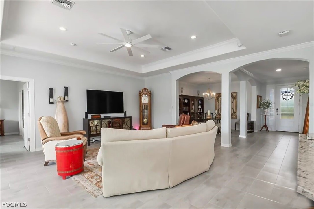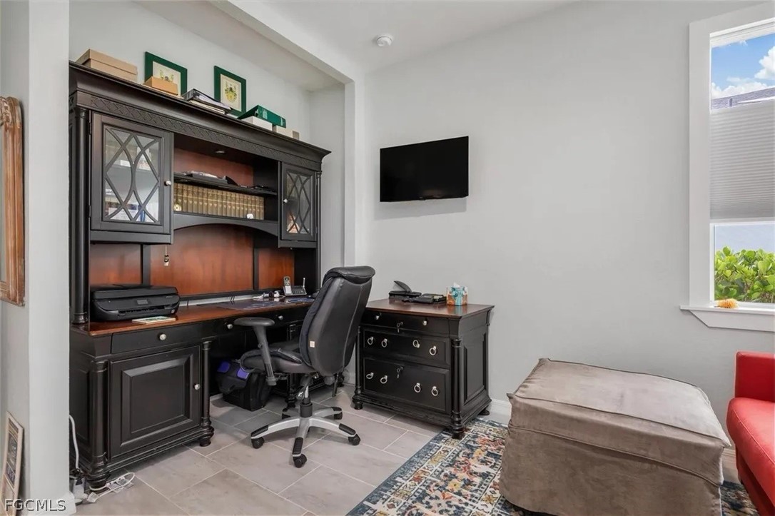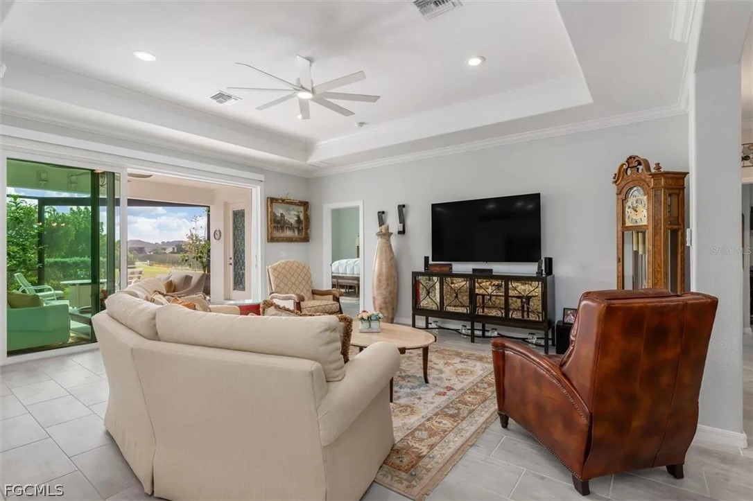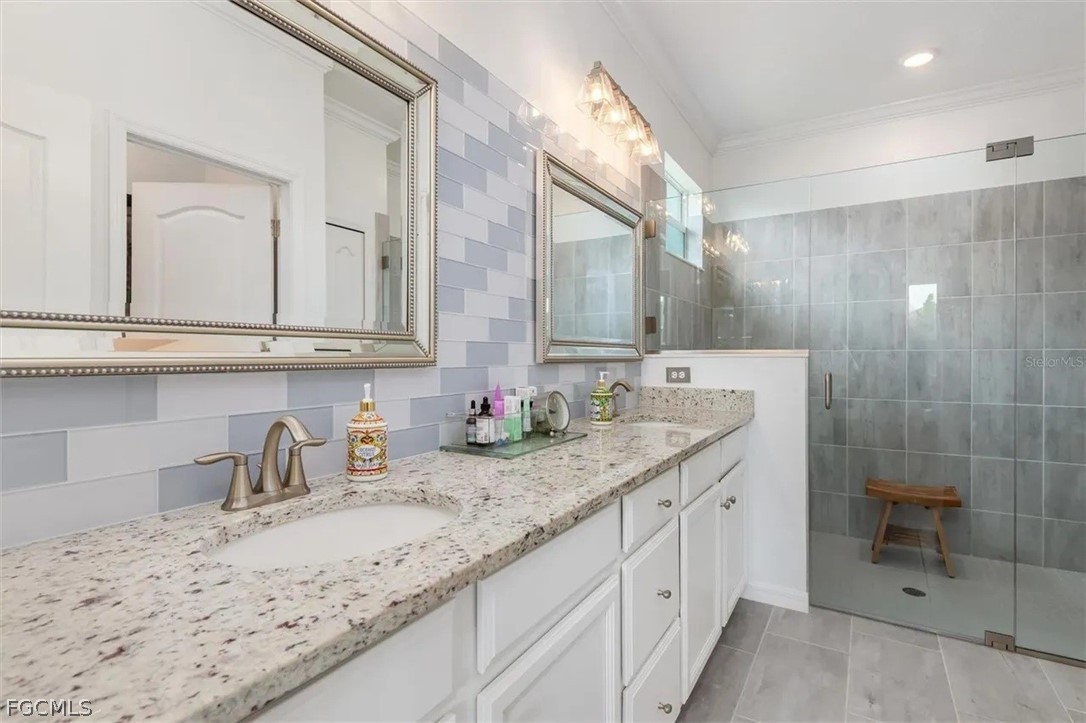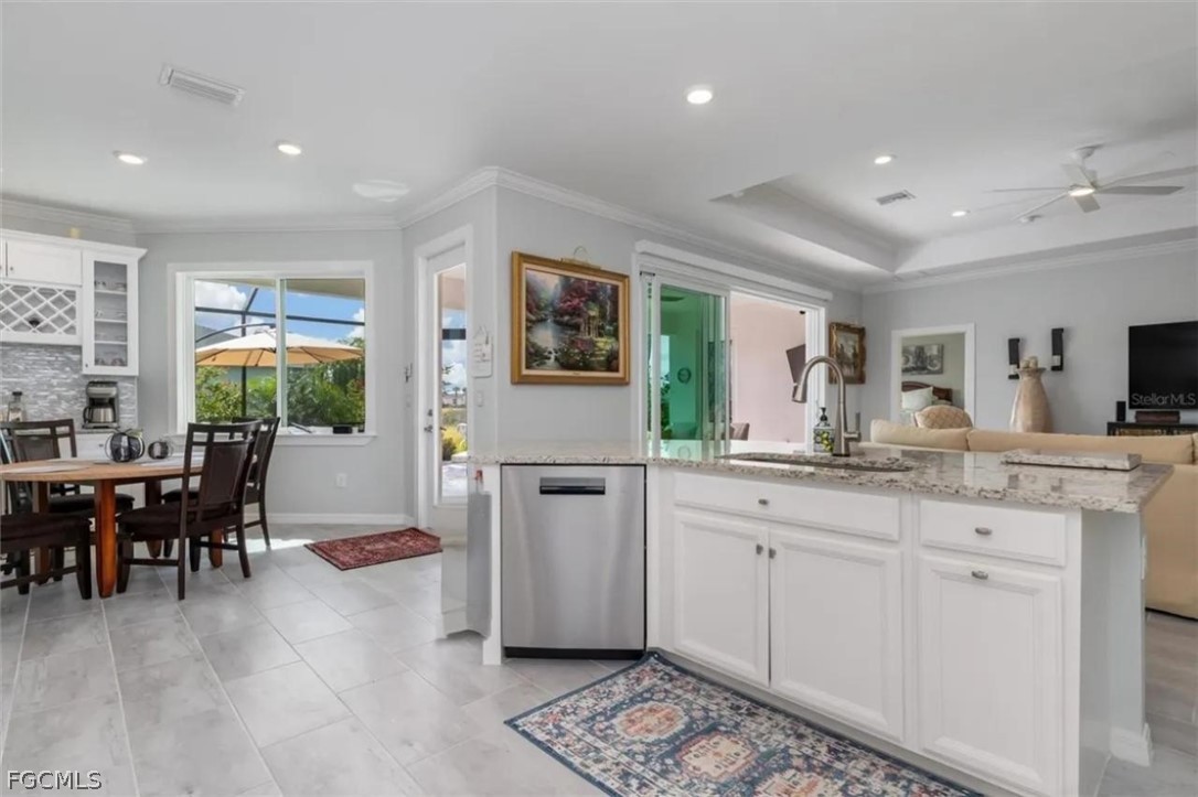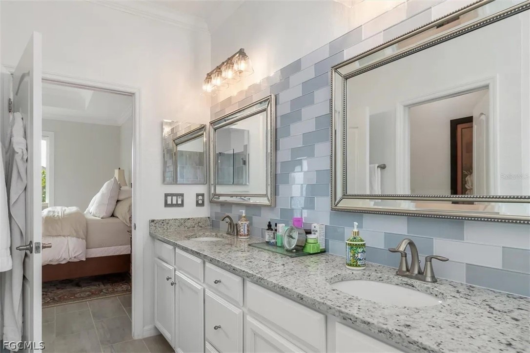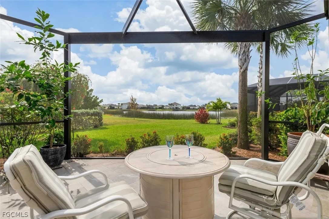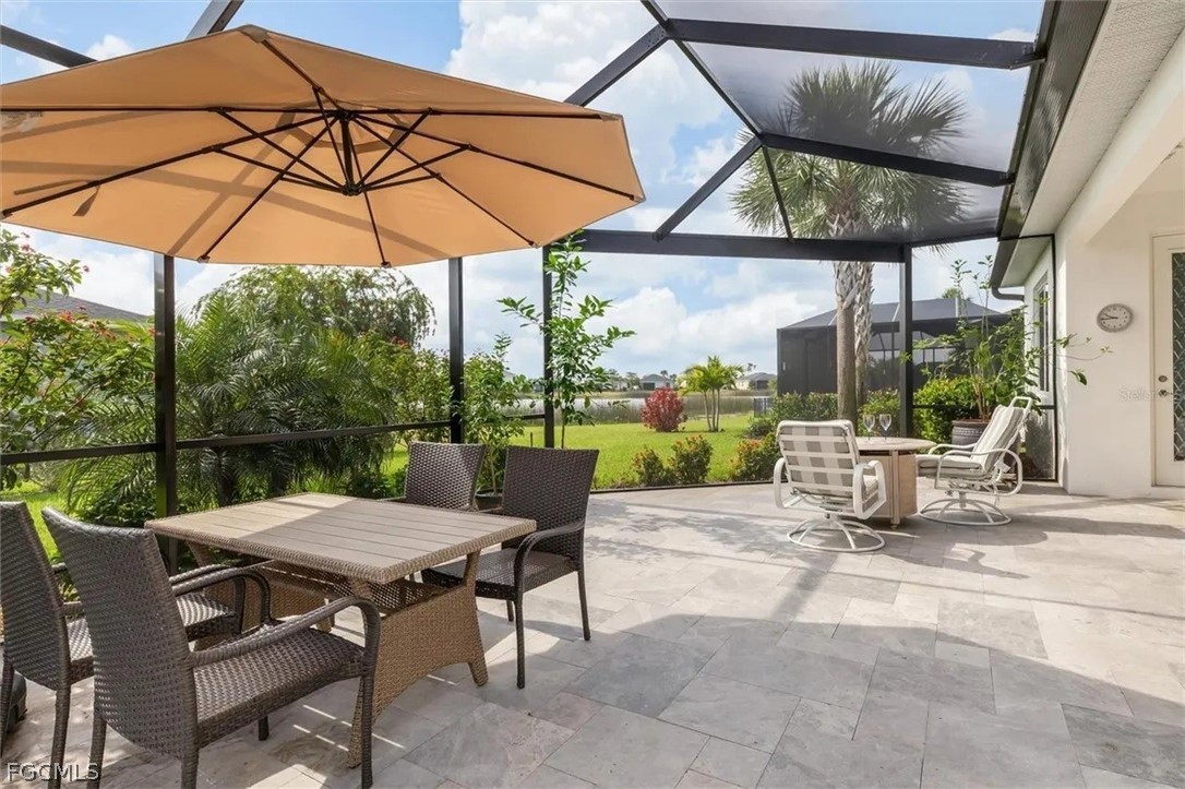 The open-concept layout was enhanced by removing the dining room wall, allowing for uninterupted flow through the spacious living areas and out to an expansive lanai. Here, you’ll enjoy serene, unobstructed water views with a sought-after southeastern exposure—ideal for both relaxing and hosting guests. Honed marble pavers add a touch of timeless sophistication to the outdoor space. The owner's suite has custom closets, dual sinks with tile backsplash, and a seamless glass shower enclosure for a lux experience.