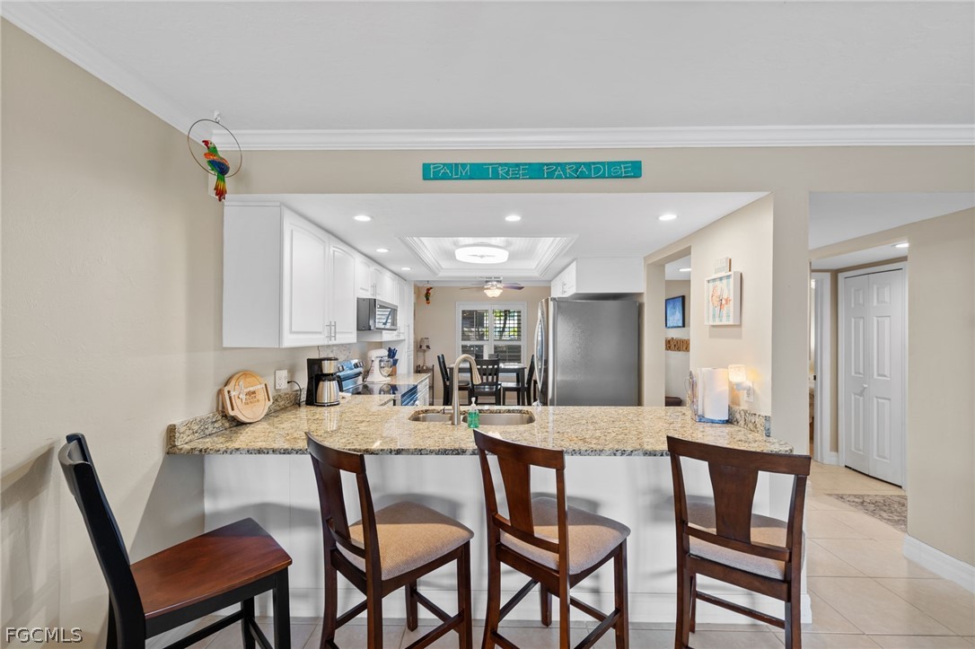 This first floor condo has a stunning view. Walk inside and look straight down the intersecting canal. The master suite is quite large with amazing canal views. The huge living room gives you lots of space to hang out or entertain and opens into the kitchen with granite countertops and stainless appliances. The AC system was replaced in 2025, and the building has a new roofer. The HOA has great reserves and has updated everything include the pool area, resurfaced the parking lot, new carports, and recently painted the buildings. This is a very well ran HOA with solid financials.