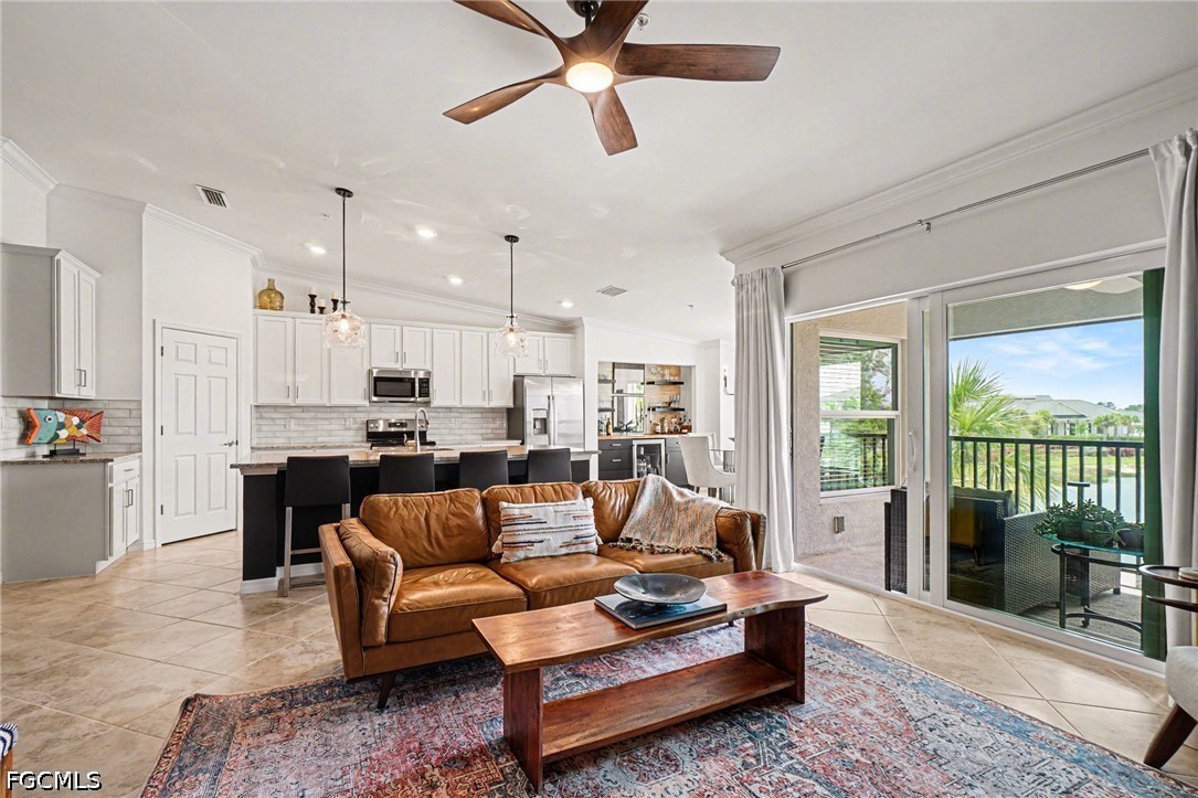 The open-concept floor plan seamlessly connects the kitchen, dining, and living areas—ideal for entertaining. A spacious kitchen island anchors the space, providing the perfect gathering spot after a day on the course. Having both a front and rear lanai create a seamless indoor-outdoor living experience