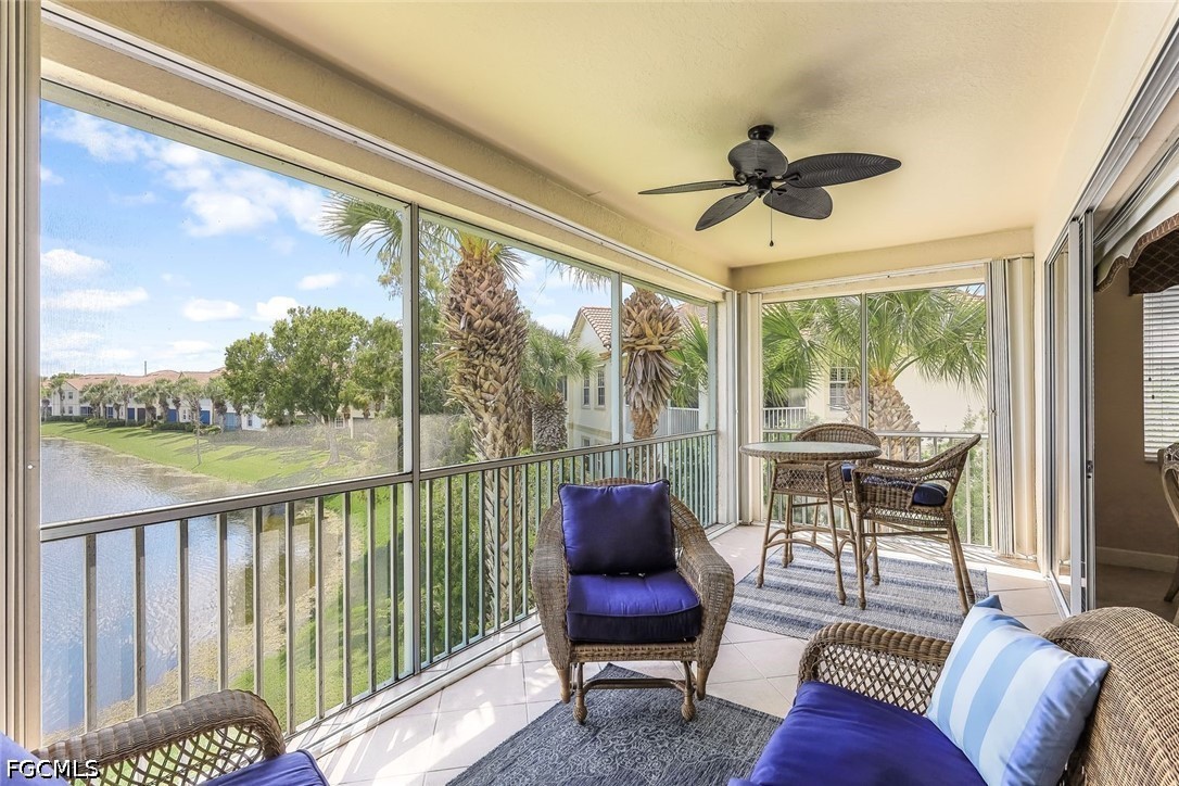 Beautifully furnished, 3-bedroom, 2-bath second-floor residence, w/attached (1) garage, accordion hurricane shutter protection and it is ideally positioned at an elevated vantage point, offering Southern exposure w/sweeping views of an expansive lake and lush tropical vegetation as seen from main living space and upfront from the oversized Lanai (an outdoor extension to the living space). Enjoy ultimate privacy surrounded by swaying palm trees and serene natural beauty as you sip your morning brew or night cap).