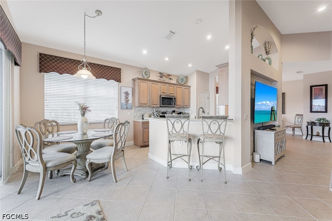 This impeccably maintained condo offers soft neutral tones and a casual coastal environment. A Great Rm floorplan w/formal Dining Rm, Eat in Kitchen and Breakfast bar and split bedrooms: Master ensuite overlooks the lake w/slider access to Lanai, w/KS bed, lge walk in closet, a spacious five fixture bathrm (dual sinks). Guest BR 2 offers QS sleeping and GBR 1 is set up as a guest retreat w/QS bedding and it’s large enough to have a full size sofa sitting area. Laundry is in residence w/added cabinetry. Kitchen offers clean lines w/travertine backsplash, stainless appliances and abundant counter space. Access to the garage from your ground level foyer.