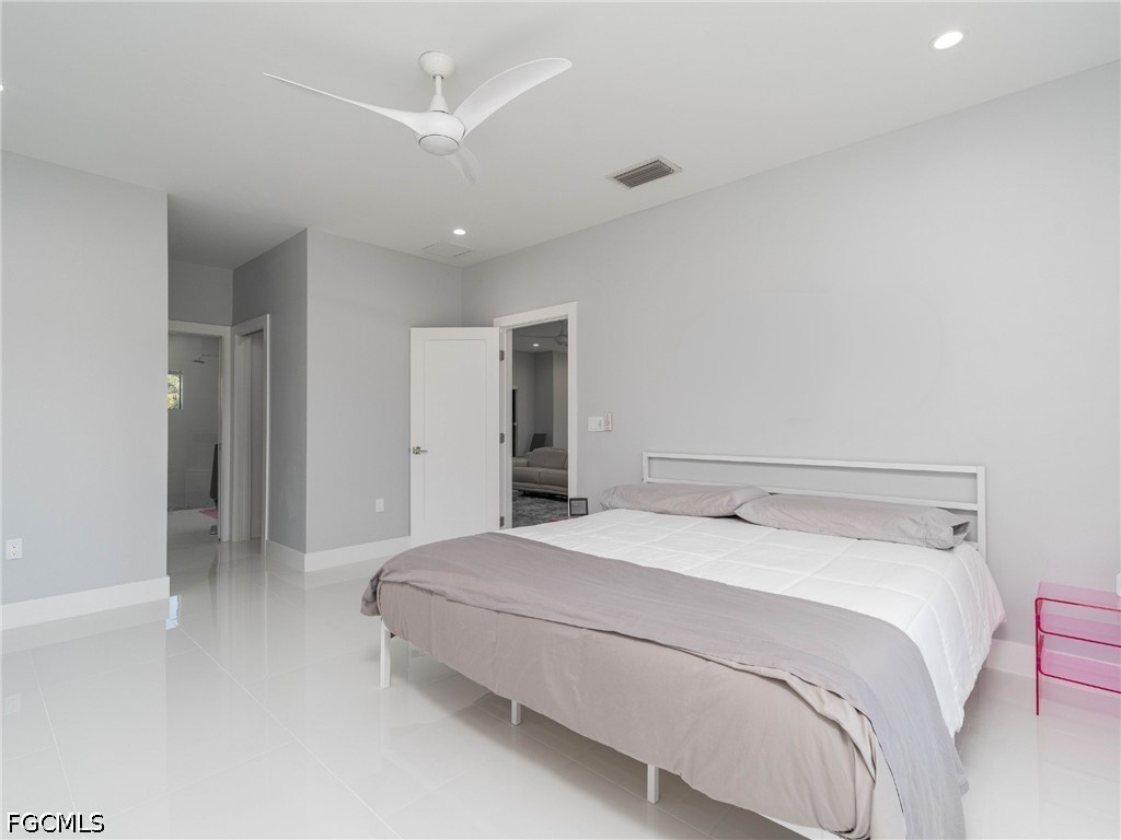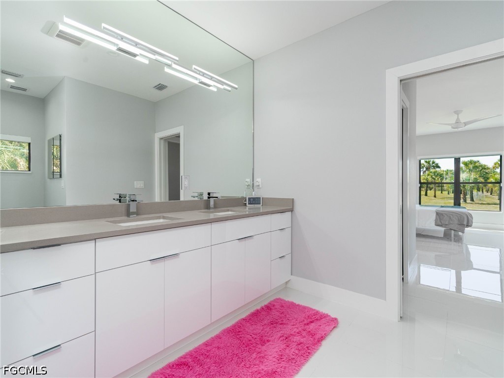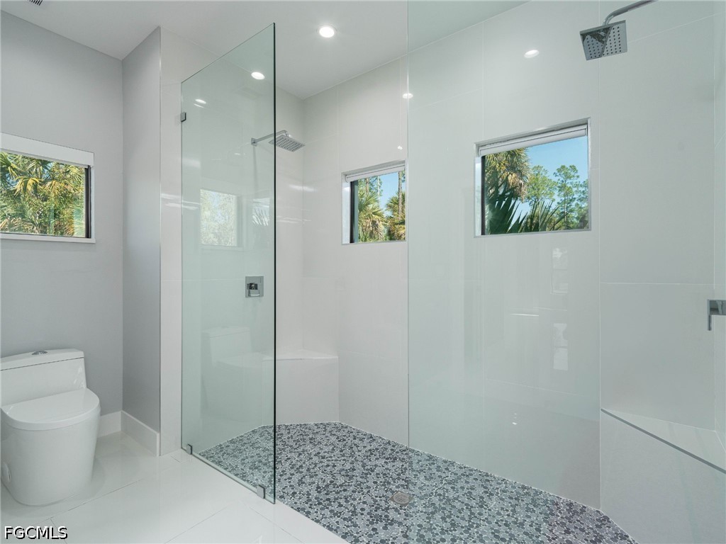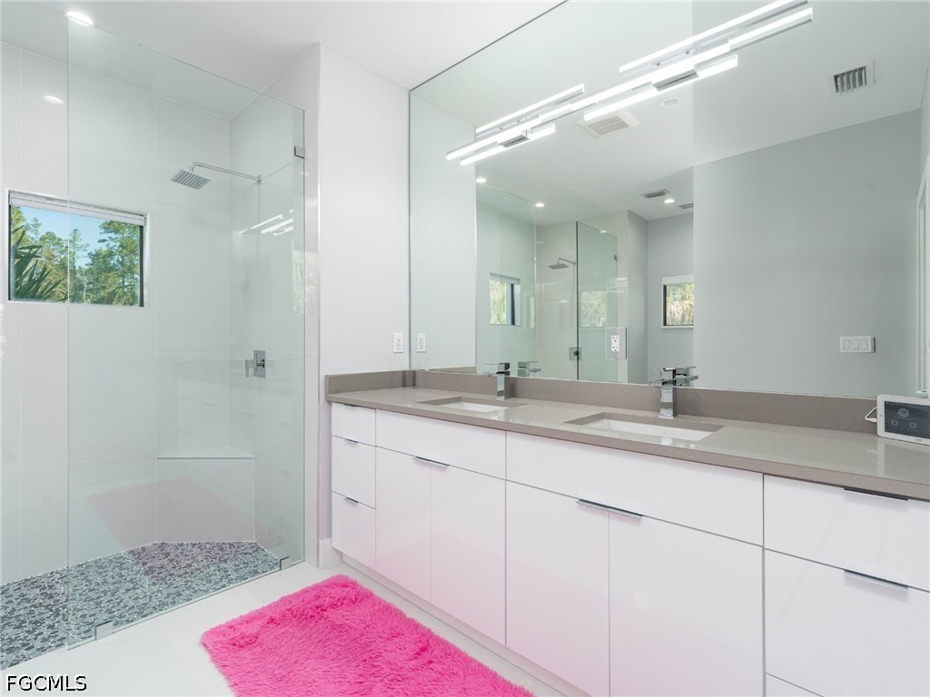 The spacious bedrooms include a luxurious primary suite with a spa-inspired bathroom featuring dual vanities and a walk-in shower with two shower heads on opposite sides.