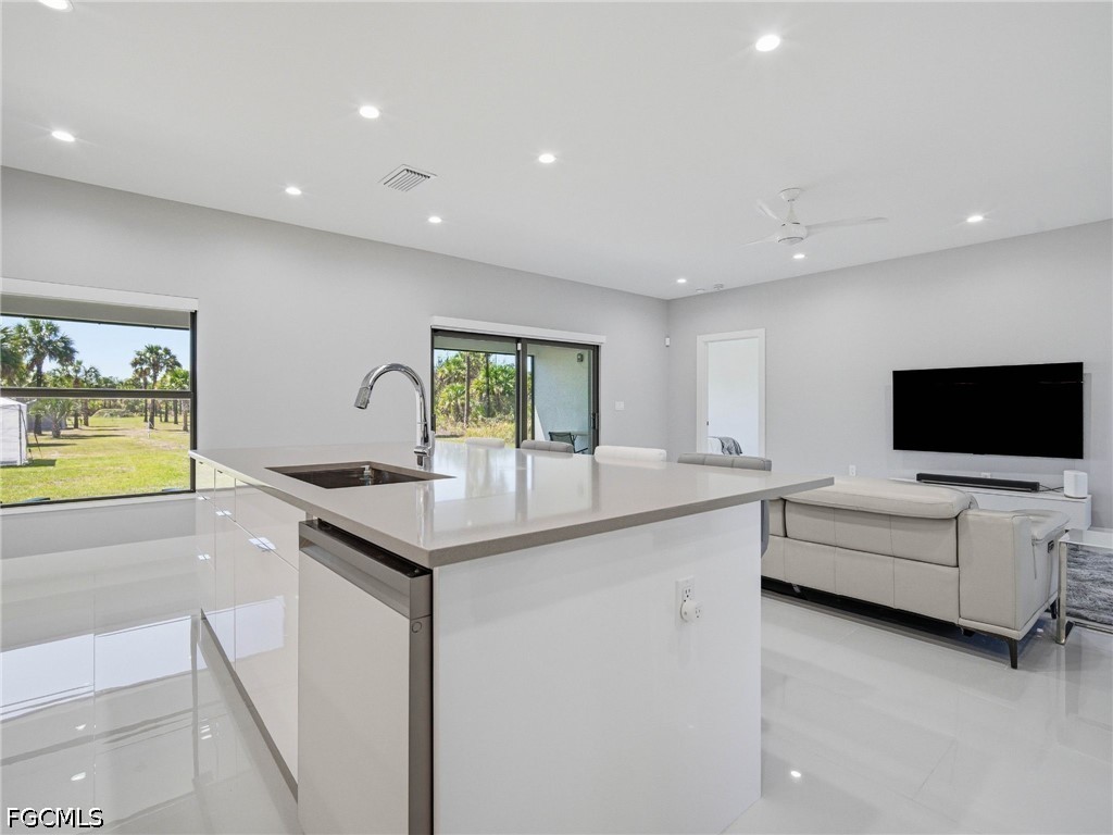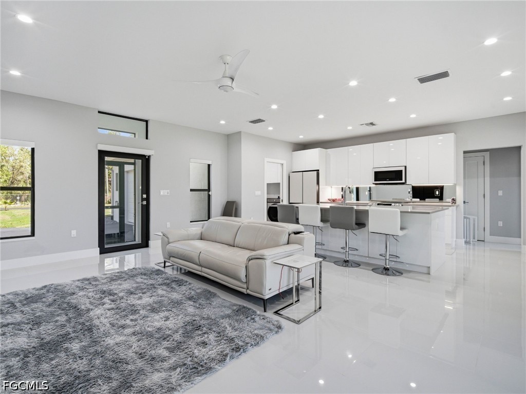 Step inside to soaring ceilings, oversized glossy tile flooring, and an abundance of light pouring in from every angle. The open-concept design creates a seamless flow between living, dining, and kitchen spaces, offering a sleek and sophisticated atmosphere perfect for both relaxing and entertaining.