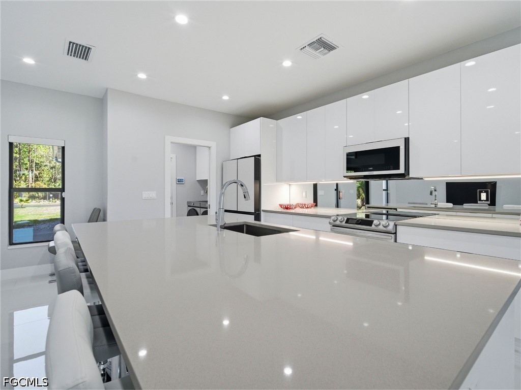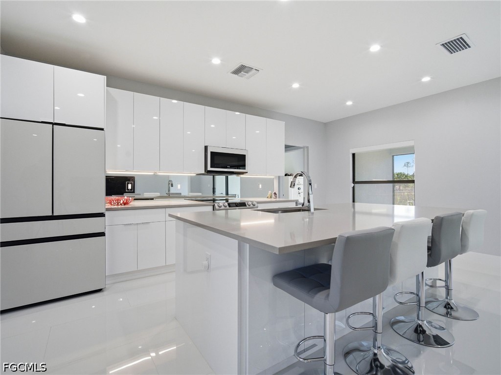 The gourmet kitchen is a true showpiece, featuring a large waterfall island with seating, quartz countertops, high-gloss European-style cabinetry, and high end Samsung stainless steel appliances—all designed with clean, modern lines.