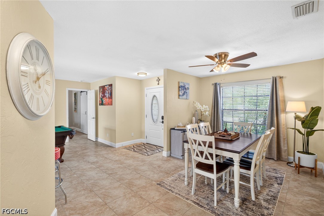 Check out this well-maintained Florida home located in the prosperous Pelican Neighborhood of SW Cape Coral, FL with palms galore! This 3-bedroom home with 2 full bathrooms has a very unique floor plan that feels much bigger than 1,853 sq. ft. – featuring a separate area upon entry currently being used as the game room, which could be used as the living room, along with a separate dining room.