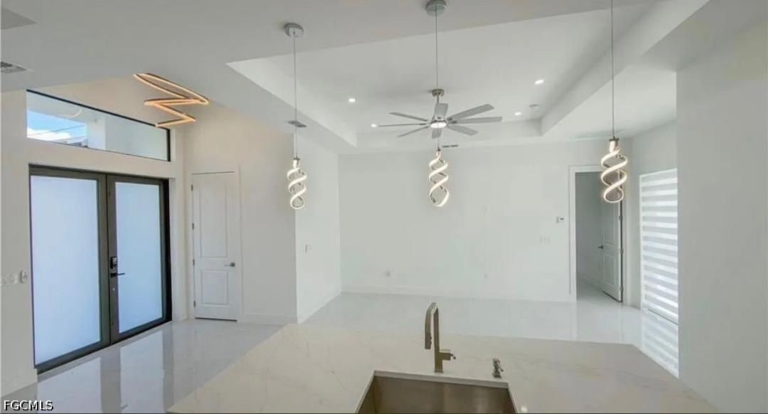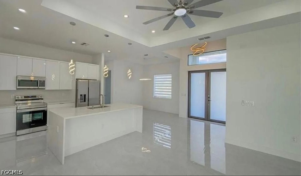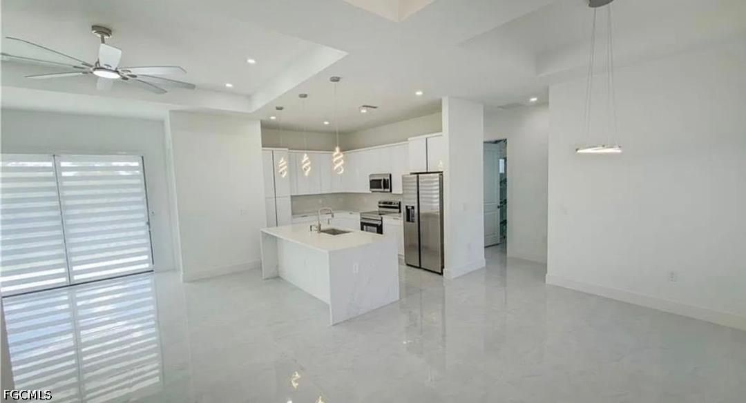 The interior features an open-concept floor plan with tile flooring throughout, tray ceilings, and abundant natural light. The kitchen is equipped with stainless steel appliances, white cabinetry, a pantry, and a spacious island that connects seamlessly to the main living area.