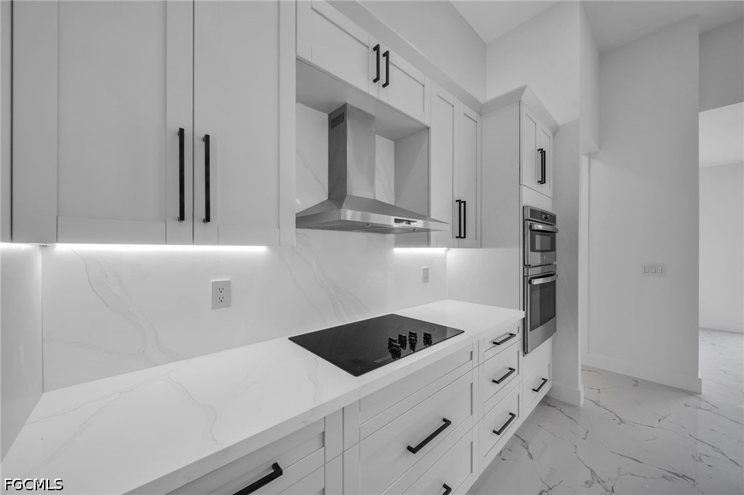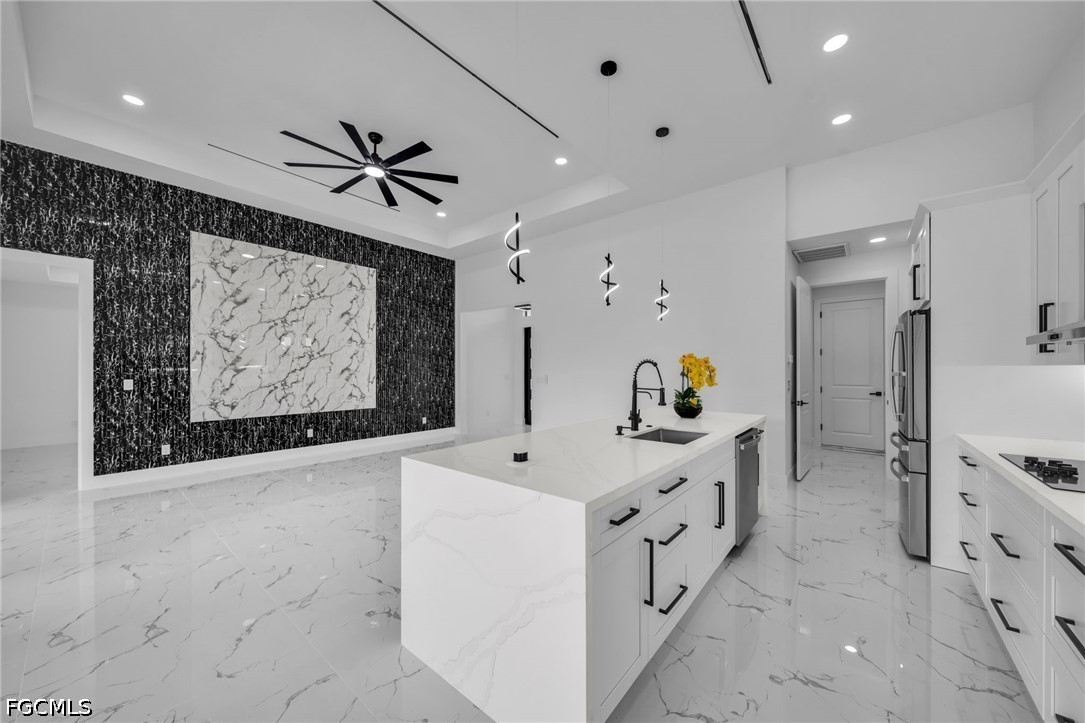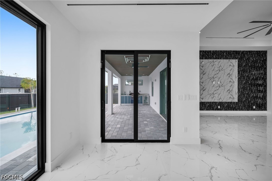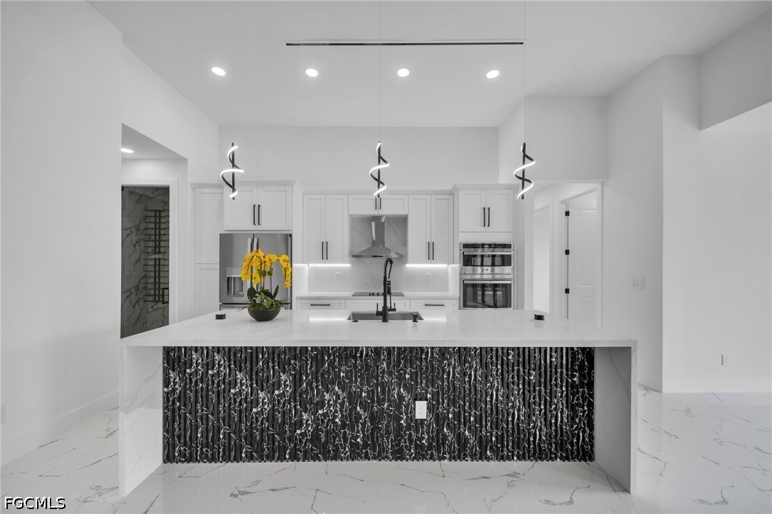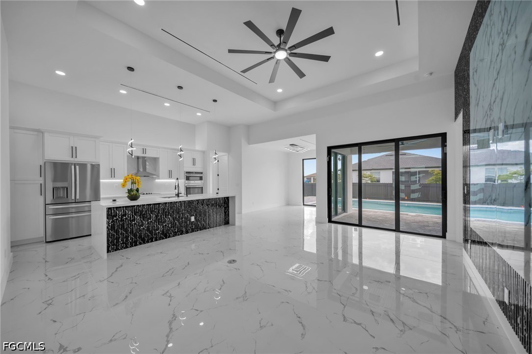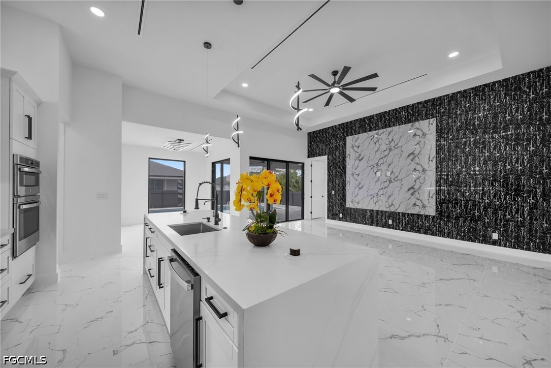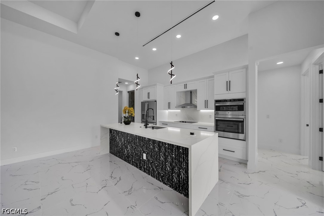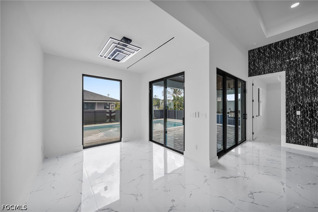 Step into modern Florida luxury in this brand-new 2026-built Sapphire model, offering 1,910 sq ft of refined living, 3 bedrooms + Den and 3 baths with a sleek, contemporary feel throughout. An expansive great room with soaring tray ceilings, full-home polished porcelain “marble” tile, and a dramatic wood-slat feature wall with book-matched slab detail creates a stunning first impression. The chef’s kitchen is the heart of the home, showcasing a large waterfall island, white shaker cabinetry, quartz counters and backsplash, walk-in pantry, premium stainless appliances, and bold gold hardware illuminated by sculptural LED pendants. Corner and triple sliders stack completely to blend indoor and outdoor living, opening to a pavered lanai, outdoor kitchen with grill and fridge, and a sparkling pool for effortless entertaining. The split plan primary suite features a tray ceiling, generous walk-in closet, and spa-inspired bath with double vanities and an oversized walk-in shower, while guest rooms enjoy a stylish bath that doubles as a pool bath. Additional upgrades include impact-rated windows and doors built to 2023 Florida Building Code, tall interior doors, designer fans and lighting, dedicated laundry room, and an oversized 2-car garage, all in a clean, modern package that feels like a boutique resort the moment you walk in.