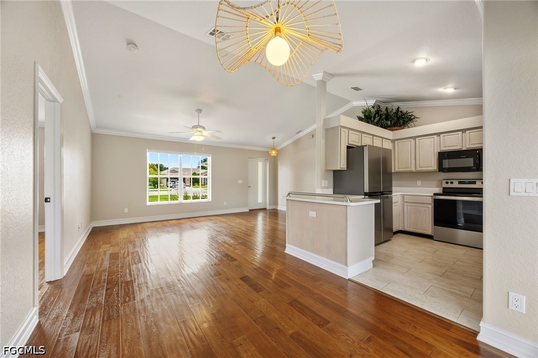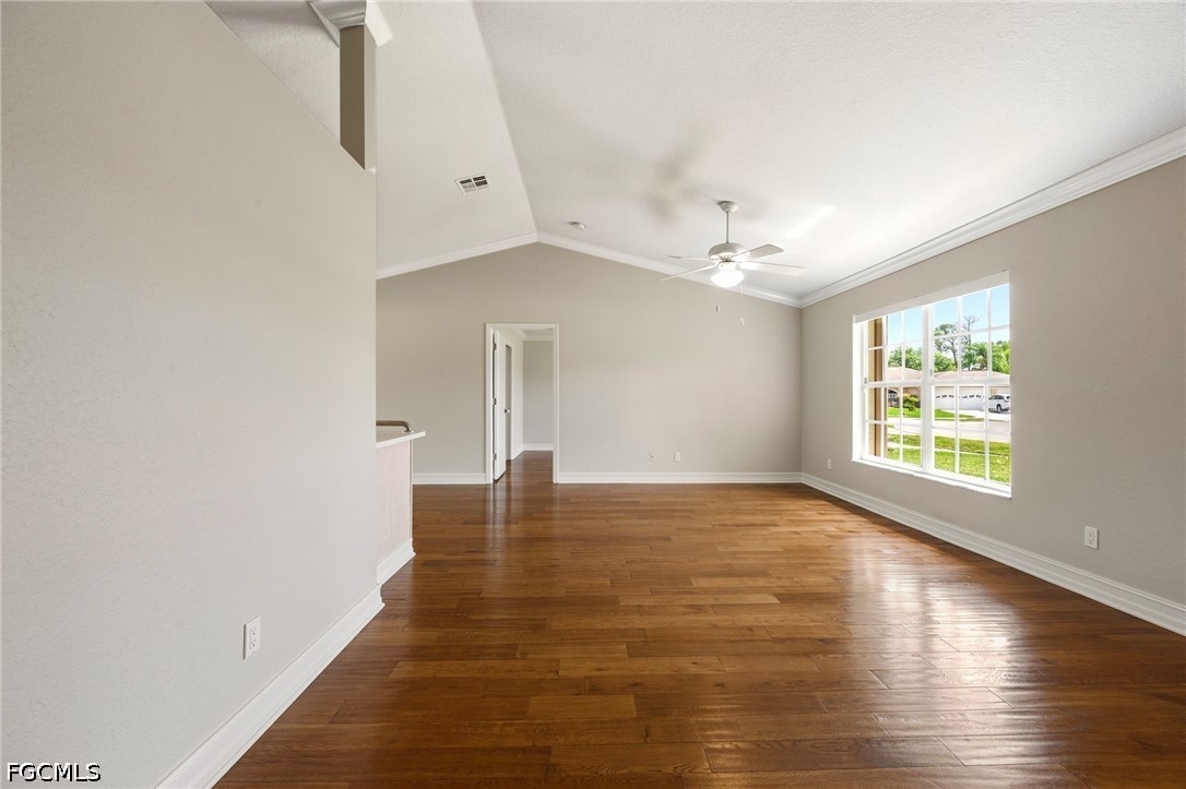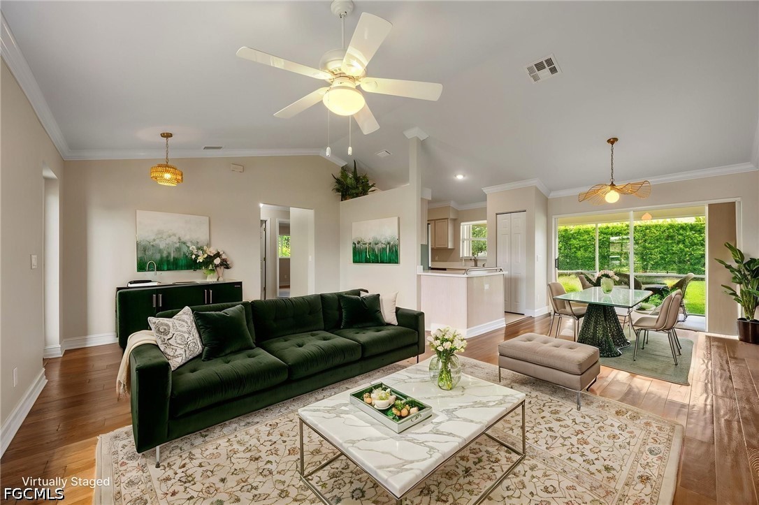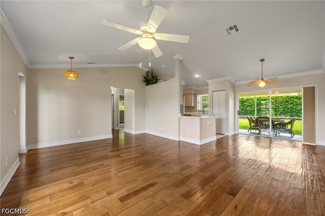 soaring ceilings in the great room, rich engineered wood floors underfoot, and elegant crown molding that ties it all together. Natural light pours in, creating a space that feels open, warm, and inviting from the moment you walk through the door.