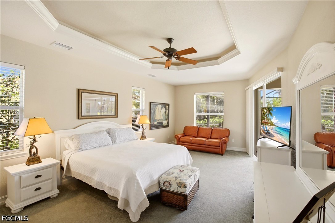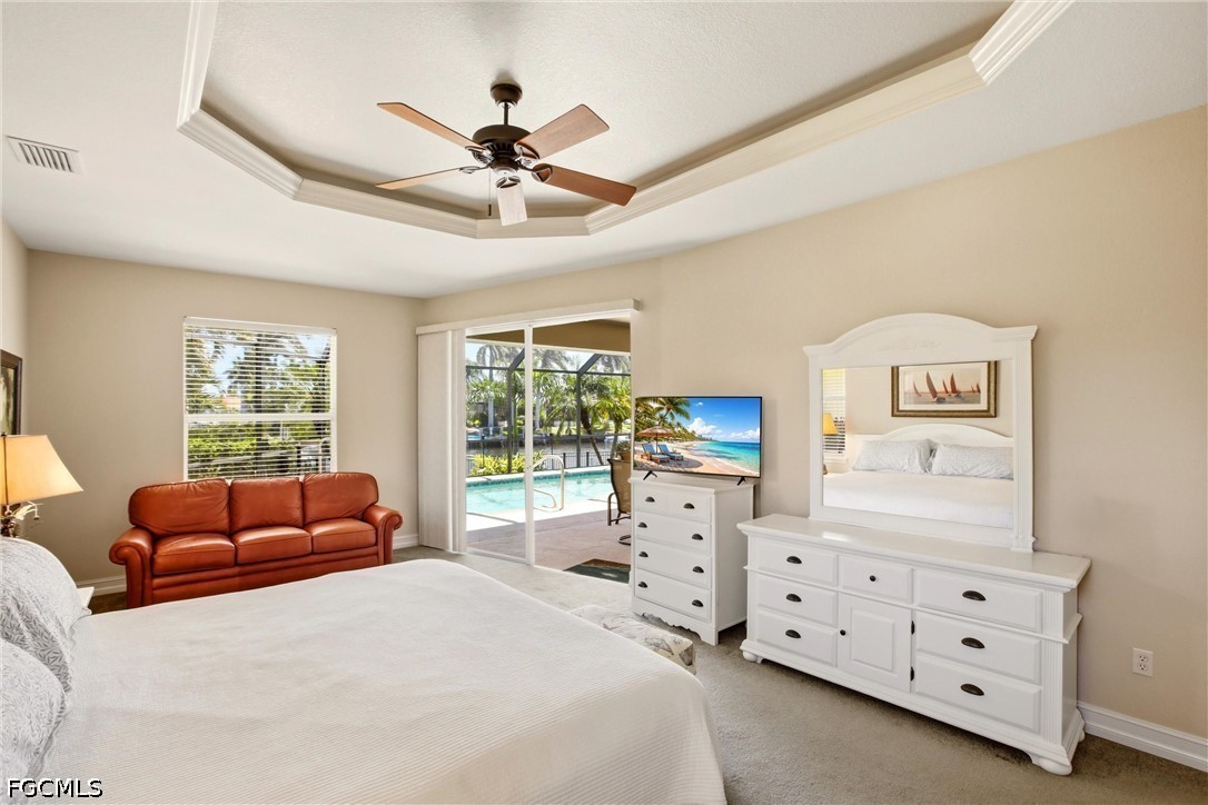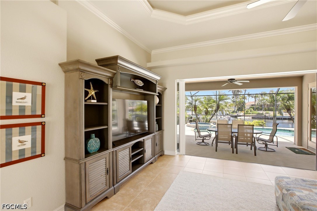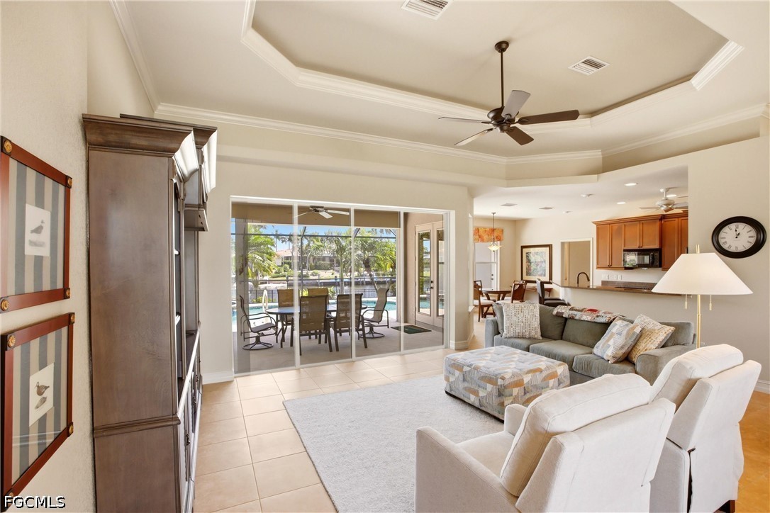 Step inside to a light-filled foyer, expansive great room, and formal dining space, all enhanced by soaring tray ceilings, crown molding, and disappearing pocket sliders that create seamless indoor-outdoor living. The main living area opens to a private resort-style lanai with heated pool and spa, perfectly positioned to capture tranquil intersecting canal views.