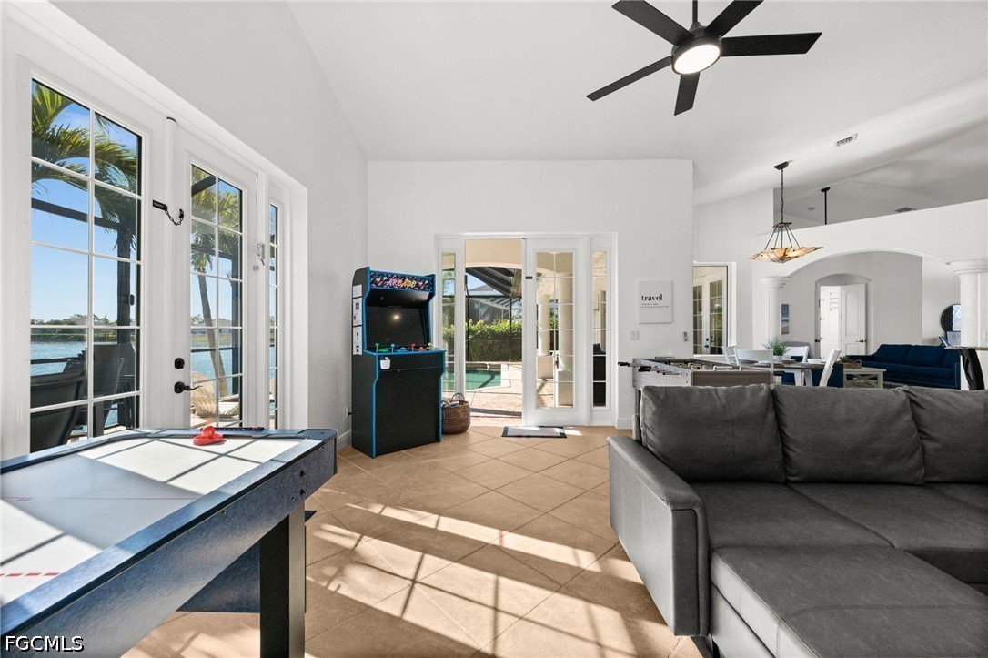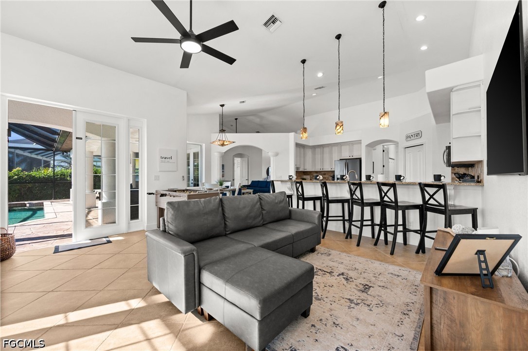 Outdoor living is where this home truly shines. The screened lanai and pool area overlook the canal, creating a relaxing waterfront backdrop for entertaining or unwinding after a day exploring Southwest Florida. The home also features multiple TVs throughout the property including the outdoor lanai, enhancing the guest experience.