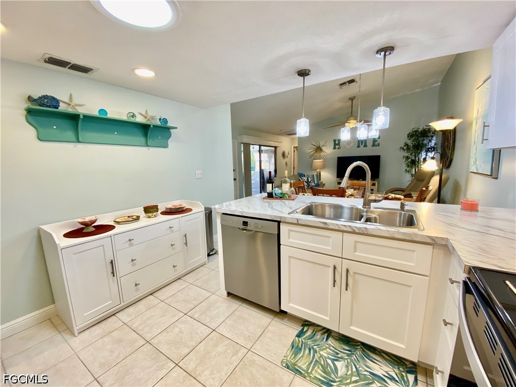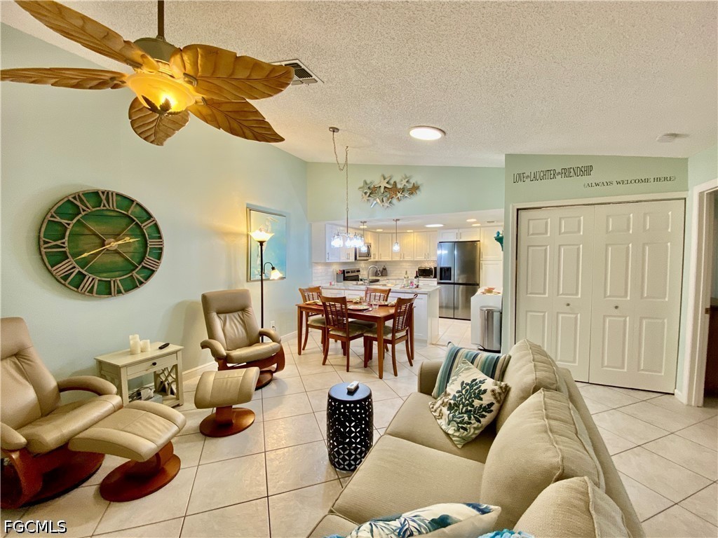 The home offers a spacious layout featuring a large living room with vaulted ceilings, an open kitchen, two bedrooms, and two full baths. The living area flows seamlessly into the kitchen, creating an open and inviting space.